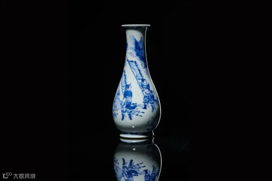 本品为胆瓶式,撇口,长颈,垂圆腹,撇圈足,胎体坚质,线条优美雅致,通体施透明釉,釉面清润怡人。釉下以青花为饰,器身通景绘刀马人物纹样,人物神态自然形象,动感十足,整体视觉效果小中见大。整体装饰层次分明,画面布局清晰,所绘青花妍丽秀雅,有浓淡深浅之别,笔触皴染得宜,分水技法炉火纯青,为康窑青花“蓝分五色”之典型代表。