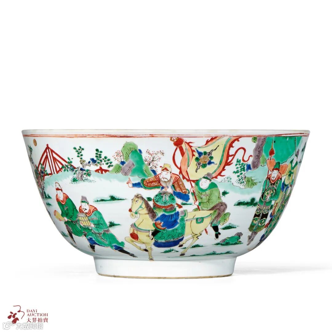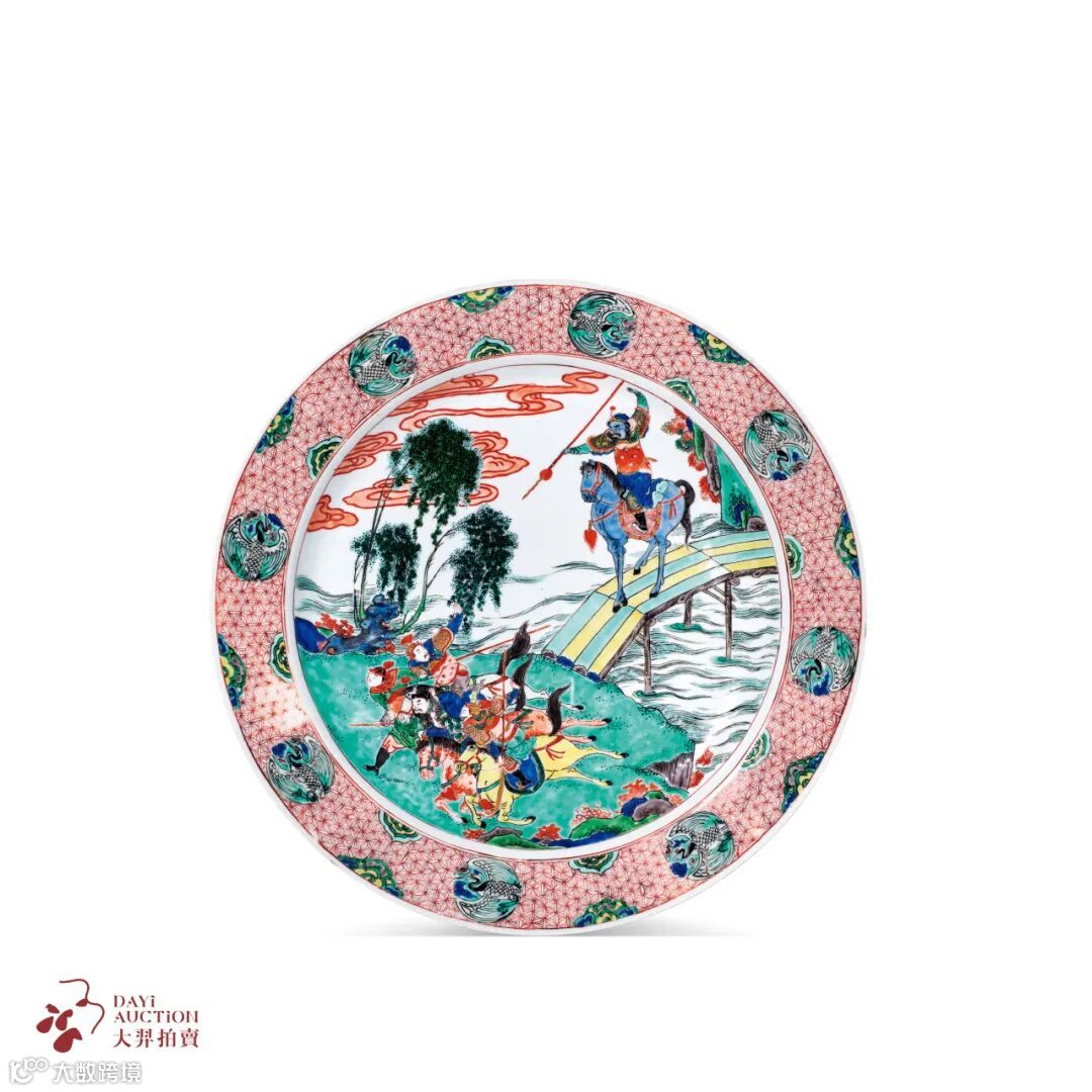 本品折沿浅腹,造型别致。通体五彩绘饰,盘心主题画面为《三国演义》著名桥段之一“长阪坡之战”。长阪坡之战发生于中国东汉未年。曹操派遣曹纯率领五千号称天下骁锐的虎豹骑追击刘备军。据《三国志·张飞传》记载:“K据水断桥,瞋目横矛曰:'身是张益德也,可来共决死!’敌皆无敢近者,故遂得免”。整器人物刻画生动,方寸之间,刀光剑影,一片肃杀之象。画中张飞高举丈八蛇矛,策马挺立长板桥上,桥下虽仅绘寥寥数人,却将曹军百万骑兵四处逃遁、惊慌失措之景表现得淋漓尽致,实为一件不可多得的康熙五彩佳作。