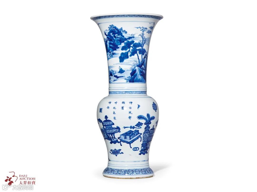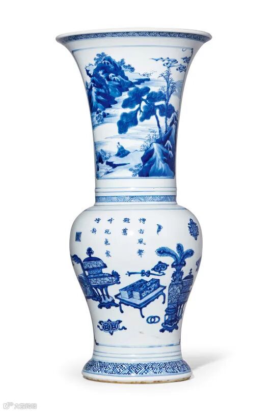 尊撇口,束颈,丰肩,鼓腹渐收,圈足,器形硕大挺拔,胎体厚重,釉光肥润。外壁通以青花为饰,口沿处绘锦地卐字纹,颈部及腹部开光内绘山水图,远山近景,渔舟唱晚,意境深远,另侧绘博古图,书诗文“博古风华虽旧,时玩气象增新”,字迹工整。此器造型、釉色、画工均属上乘,青花发色浓淡有致,画面格调幽雅,时代特征鲜明。
