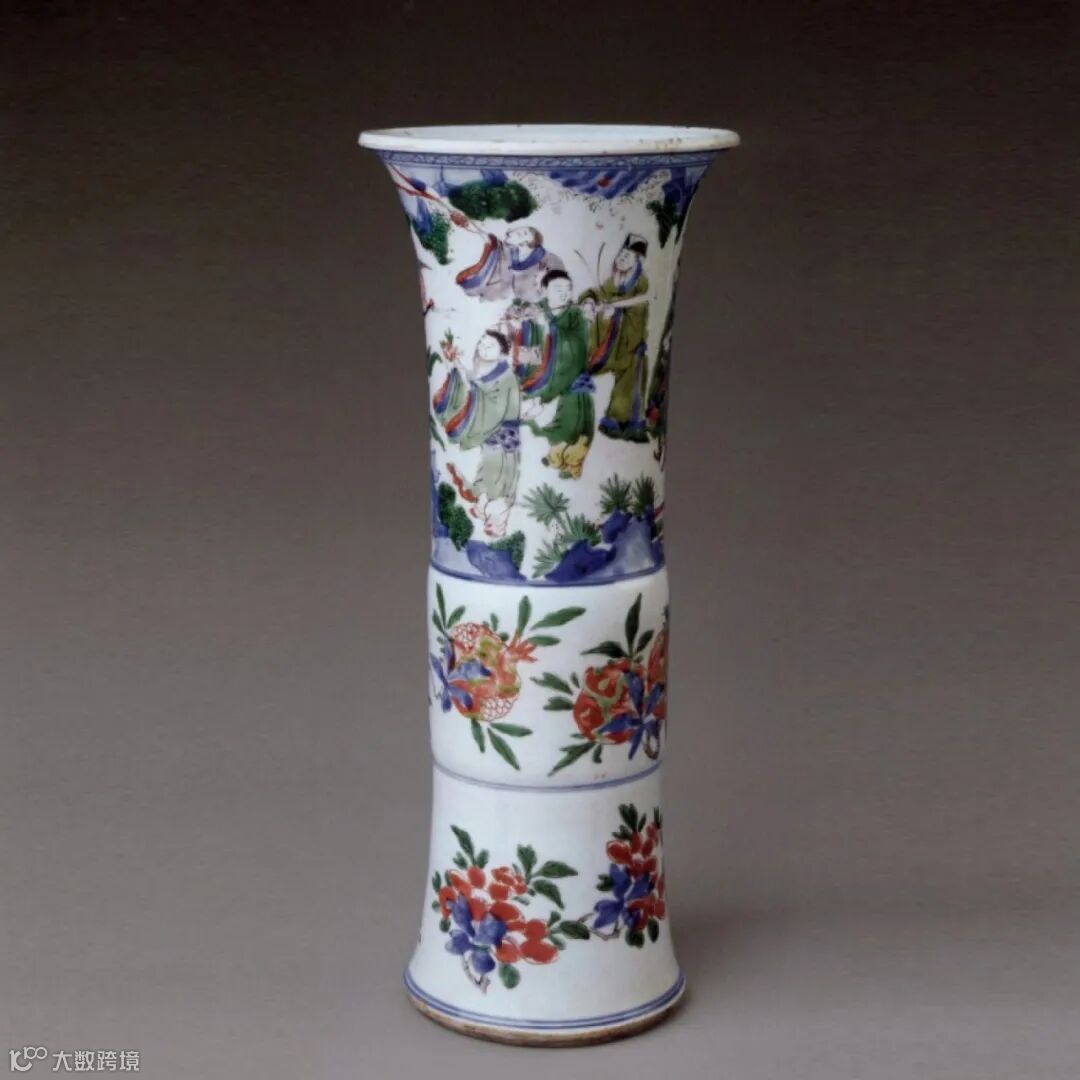 本品撇口,直腹微鼓,平底。通体以三段式构图方法,以青花五彩在颈部、腹部、胫部分别装饰贵妃醉酒图、折枝花卉纹及折枝花果纹。本品所采用的三段式构图为顺治时期流行的花觚装饰手法并延续至康熙时期。画中杨玉环发髻华丽,垂目微醺,醉酒而舞,神态悠然,身侧仕女含笑而视,一副热闹喜庆景象。人物神态各得,颇为喜庆,青花与五彩均发色鲜艳夺目。高超娴熟的绘画技法将人物形象刻画的栩栩如生,衣褶折迭错落之处尤见功力。此花觚造型端庄典雅,施彩丰富美观,人物绘画生动逼真,艺术价值极高。