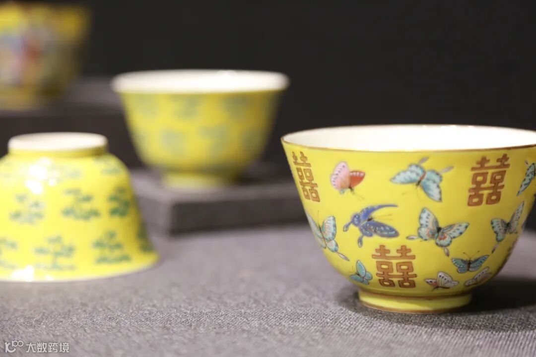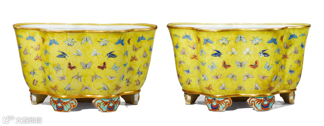 作为晚清主政的女性,其对器物的理解更加细腻独到。同治八年,大婚礼用瓷“十份和九项花色”瓷器全部烧成。然慈禧太后为保证大婚瓷完美无瑕,同治九年内廷传旨九江关监督景福补造瓷器务必精细,所有10072件大婚礼用瓷全部赔补重烧。因此在观此件拍品,能成对保存至今,可见珍贵。2021年此对清同治黄地粉彩百蝶纹蝴蝶式大花盆展出于《晚清帝后用瓷展展览》中,备受关注。