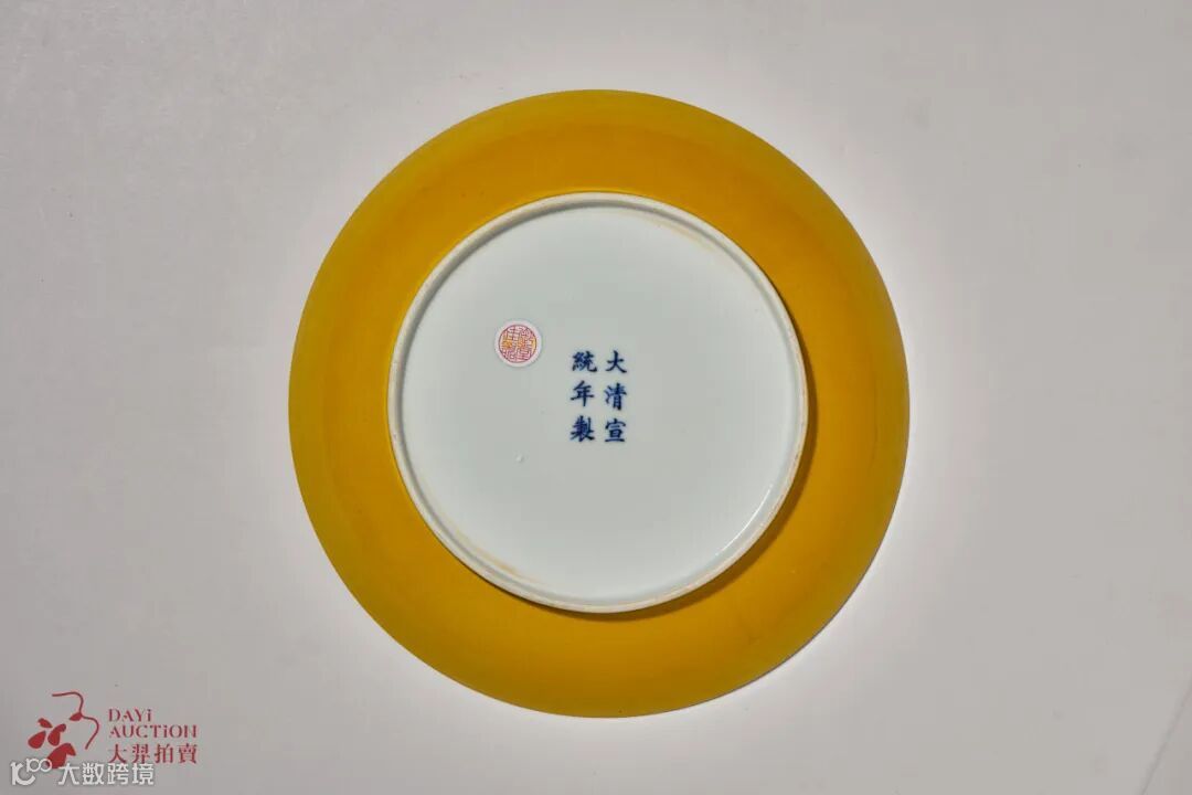黄釉彩瓷向来为帝王专用色,瓷器上纯正的黄釉始于明永乐年间,以后各朝均有烧制,为明清宫廷专用瓷,决不许民间使用。盘敞口,弧壁,圈足。形制秀美,胎质细白,盘内外壁均施黄釉,色泽匀净娇艳,莹润光亮,釉层均匀自然,静谧雅致。底书「大清宣统年制」六字雙行楷书款,款识书写规整。