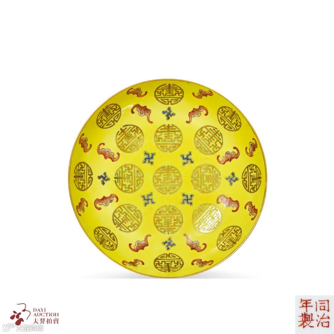 拍品与故宫博物院藏品品种相同,为景德镇奉旨烧造,专供同治皇帝大婚所用。盘敞口微外撇,弧壁,圈足,器形规整。内壁满施黄彩为地,以矾红彩、金彩和蓝料描绘蝙蝠、团寿及卍字,由内向外层层分布,排列整齐,外壁饰粉彩折枝西番莲、莲花、牡丹等四季花卉。纹饰色彩鲜艳亮丽,且大量运用金彩,突显皇家喜庆气象。