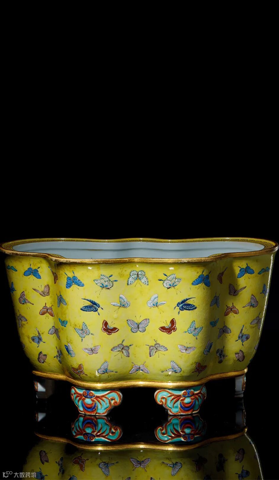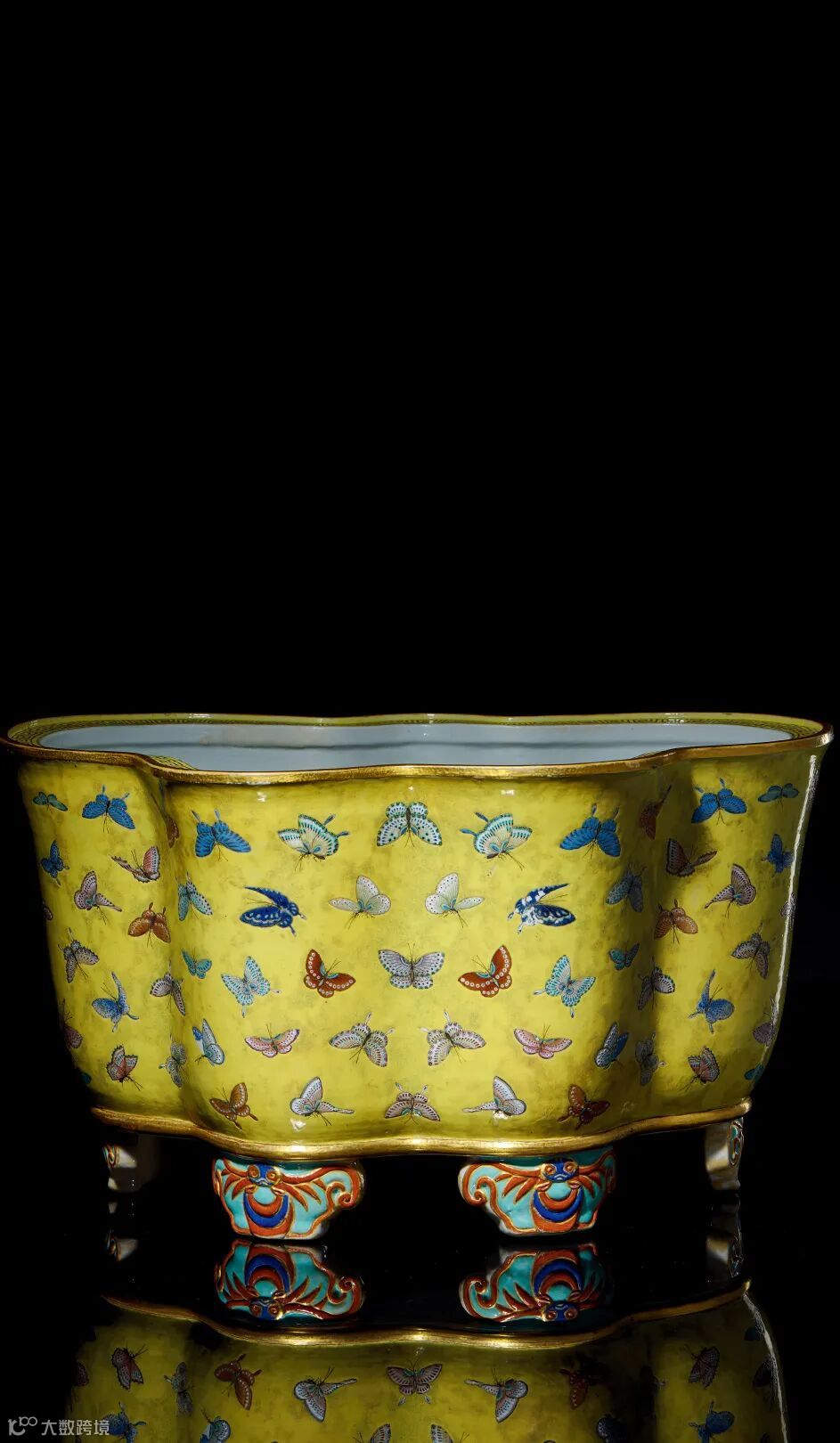 皇家之贵常以之龙凤瑞兽为衬,而本品却独具文人风骨,用蝶之柔雅之姿,辅以明黄之色,取蝴蝶之形,又以百蝶为饰,黄地凝厚贵气十足,粉彩清新华美娇艳,赫赫皇贵中透露一丝柔情。后盆中置之花草,可谓呼应自然,妙趣横生。