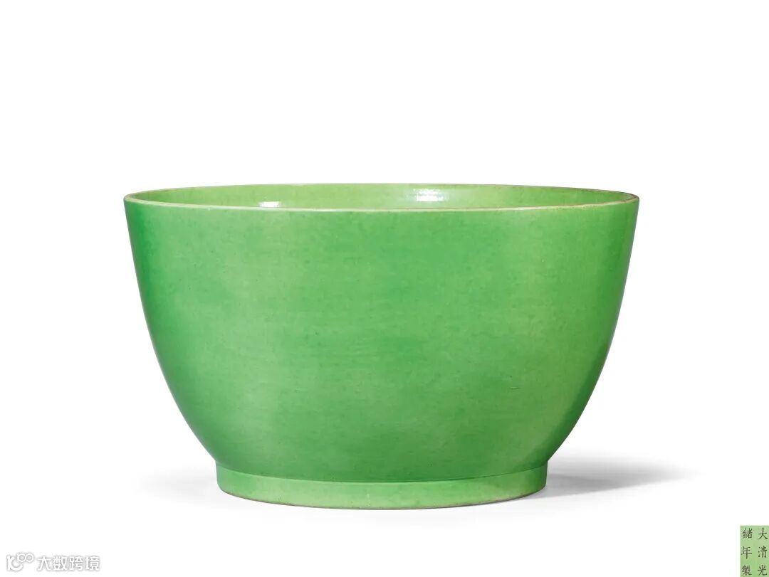 拍品碗口微撇,深弧腹,圈足。器形硕大沉稳,胎质细腻,通体施姣青色苹果绿釉,施釉匀润,釉色清新雅丽,鲜艳明亮,为不可多得的光绪御窑单色釉精品。