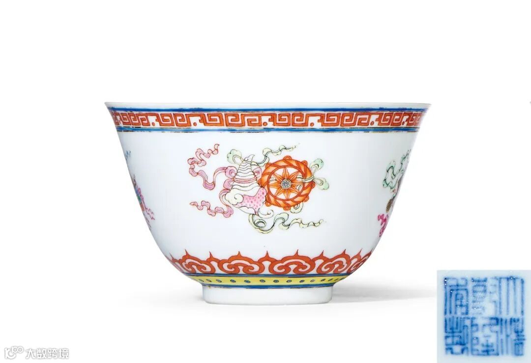 拍品小巧精致,为品茗佳器。外壁以粉彩精绘八吉祥图案,成双而配,扎饰各色结带,相互呼应。全器釉面光洁,颜色搭配雅致,色彩柔和丰富,为乾隆御窑精品。
