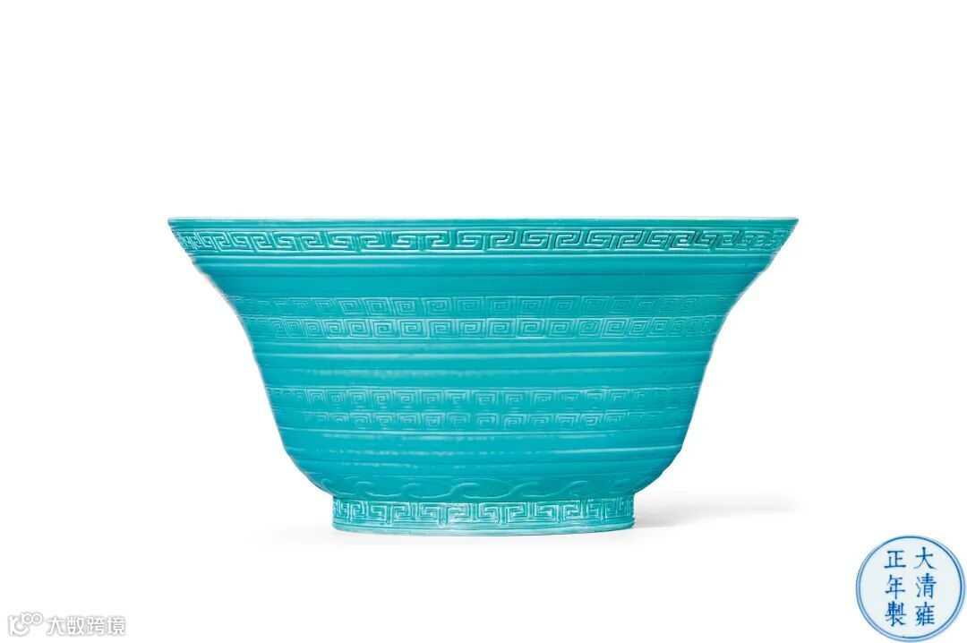大碗撇口,高束腰,深腹圈足,器形端庄。碗内素白,碗壁雕回纹,口沿和胫部各一圈变形回纹,腹部各两组回纹,相互之间以弦纹隔开。弦纹凸起,层次分明。胫部上方装饰一周海浪纹。整体雕工规整而不失华丽。松石绿釉色泽典雅,釉表泛浅银色光泽,更显高贵,为雍正官窑之精品,极为稀有。