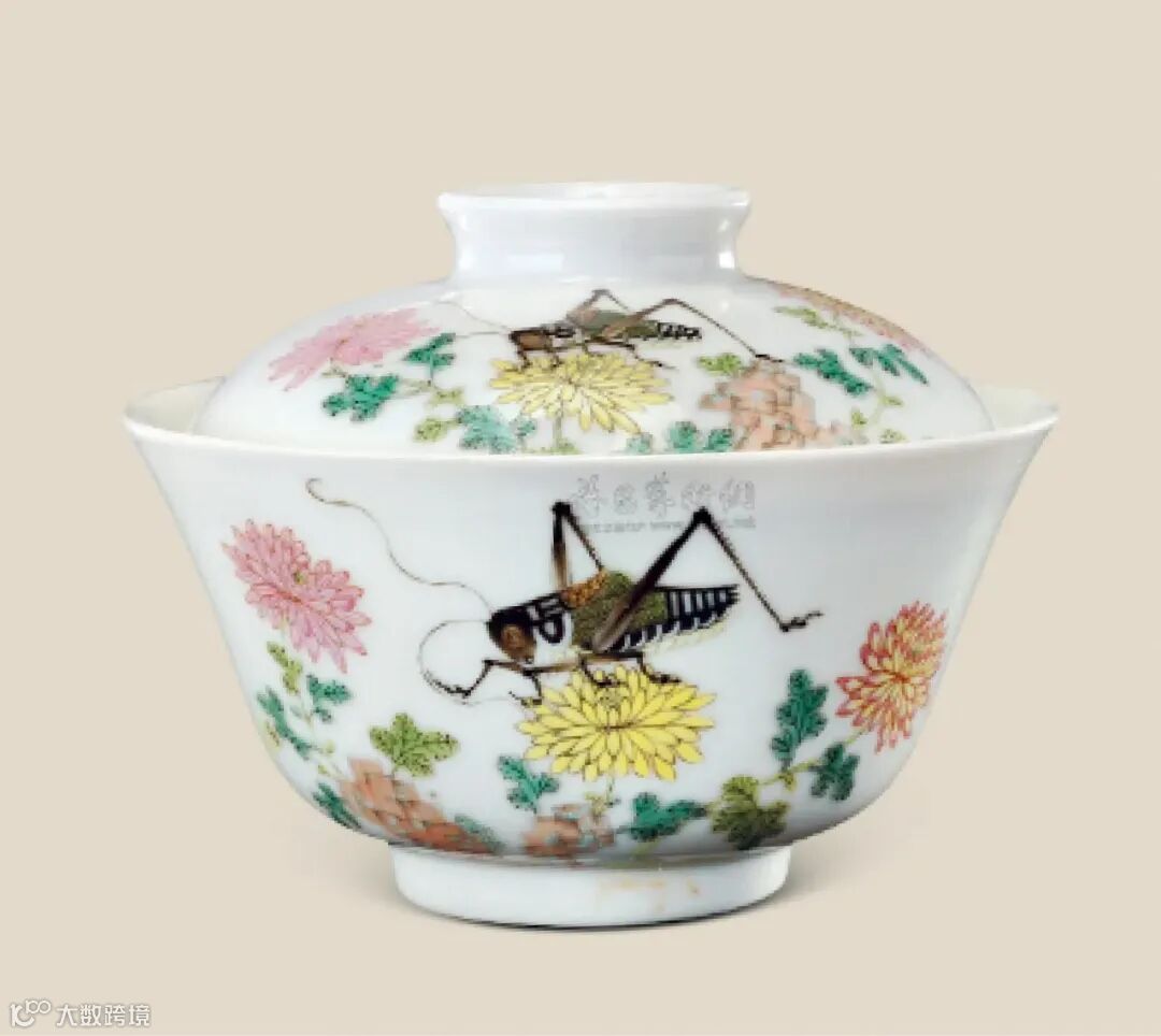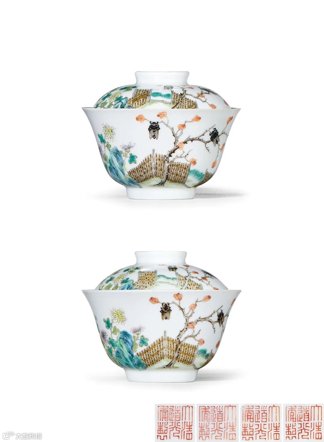此对盖碗敞口微撇,深弧腹,圈足,拱形盖,抓手钮,扣合于碗口内,足内及抓手钮内均施白釉,以红彩书“大清道光年制”六字篆书款。盖钮边及圈足沿露胎,洁白细腻。胎薄体轻,外壁与器盖均以绿、红、墨、赭、粉、白等诸粉彩绘庭院中树枝上停靠两只秋蝉,树旁数丛菊花,笔触纤弱精细,敷彩淡雅,晕染自然,以彩料的深浅浓淡表现花叶的阴阳相背,枝蔓舒展,摇曳生姿,似闻阵阵花香。