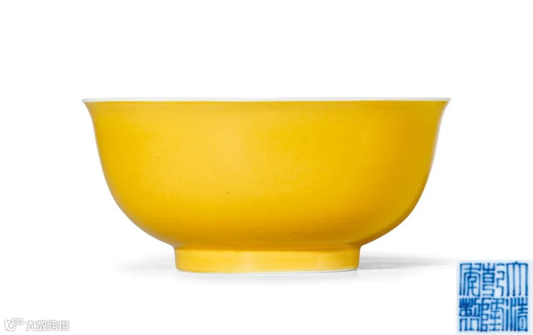 此碗口微撇,深腹,圈足。造型稳重,胎质坚洁。外壁通施娇黄釉,内壁施白釉,釉色莹润淡雅,釉面光洁亮丽,神韵雅致俱存,不失为乾隆颜色釉之隽品。底书青花“大清乾隆年制”六字双行篆书款。