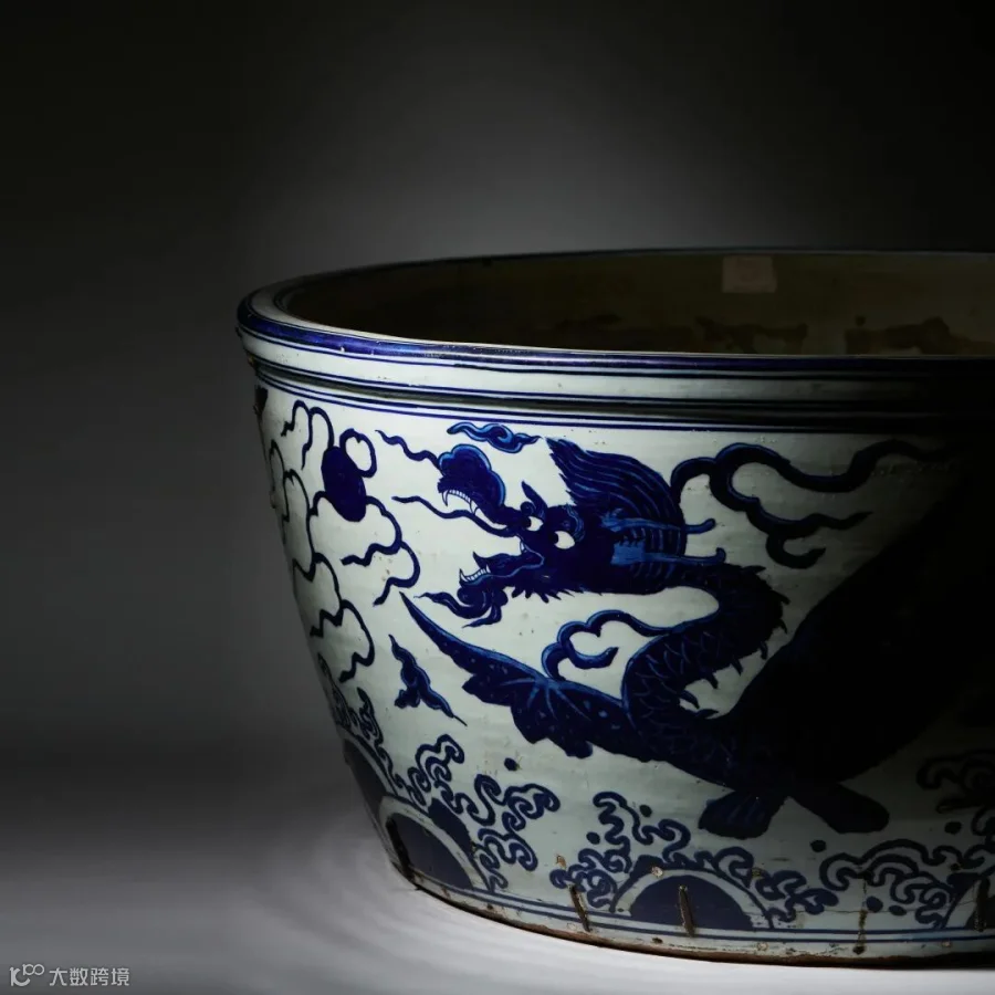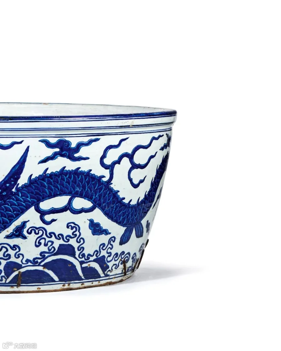 本次LOT844 明嘉靖 青花应龙海水纹龙缸是最能体现明代帝王的无上荣耀的品种。当时为了烧制龙缸,甚至专设了龙缸窑。《景德镇陶录》载:“洪武二年,设厂于镇之珠山麓,制陶供上方,称官窑,以别民窑。设大龙缸窑、青窑、色窑、风火窑、匣窑、大小横窑六种共二十座。”龙缸窑排在首位,可见从御窑厂初建开始,龙缸就是地位最重要的瓷器品种。