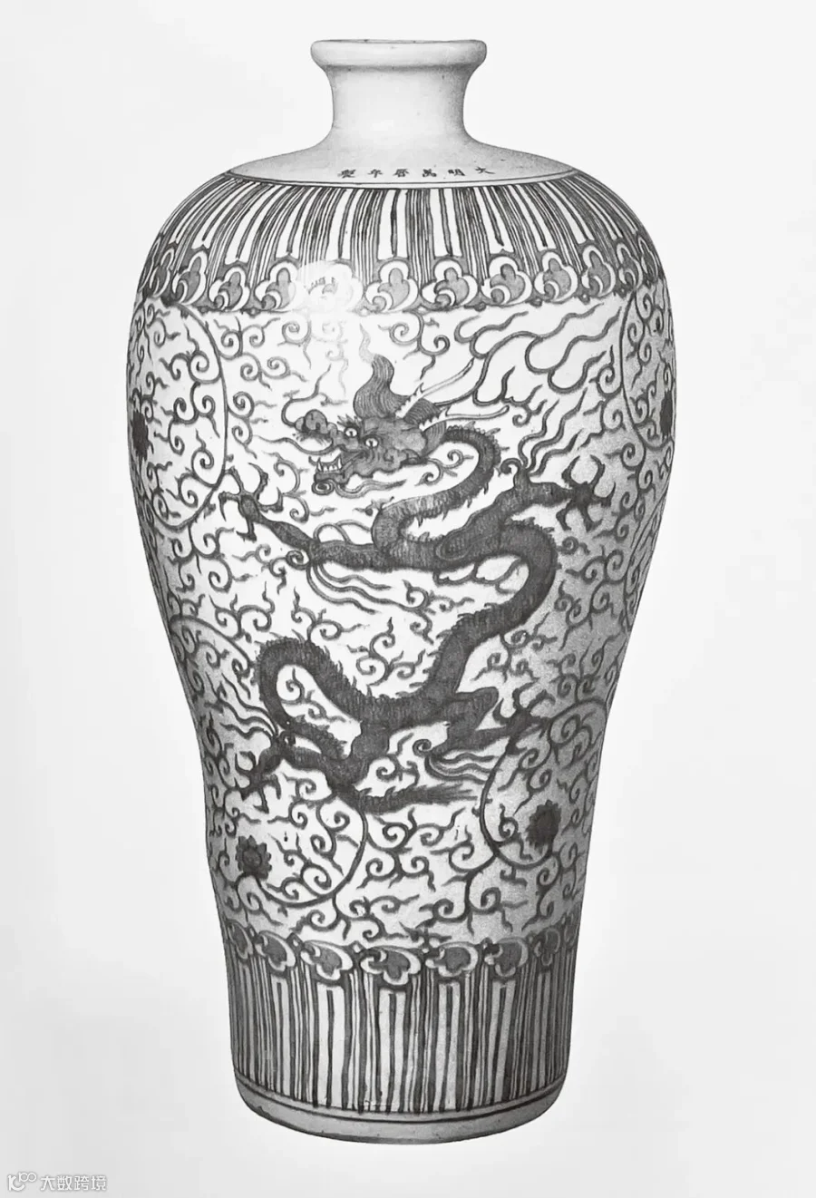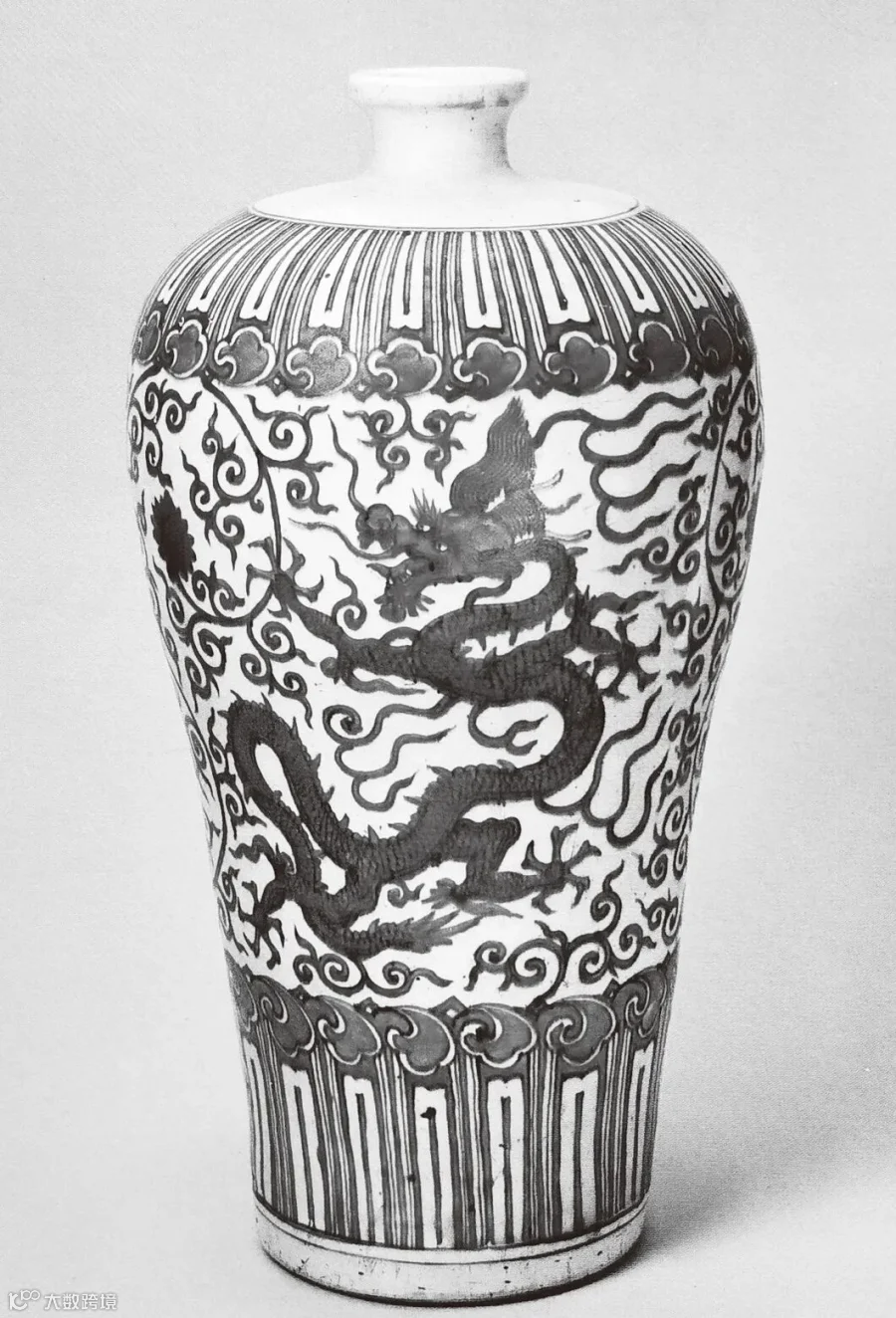 龙这一形象历来是中华民族的图腾象征,汉代许慎在《说文》中有载:“龙,鳞虫之长,春分而登天,秋分而潜渊”,因其充满神话色彩的形象,象征着皇权,在封建社会也是统治者专属的统治符号。龙在瓷器上的有这着多样的形态表现,有云龙纹、穿花龙、赶珠龙、莲池龙、海水龙纹等。明初朝廷曾下令景德镇御窑厂烧造带有龙凤纹样的瓷器,并禁止民窑烧制。