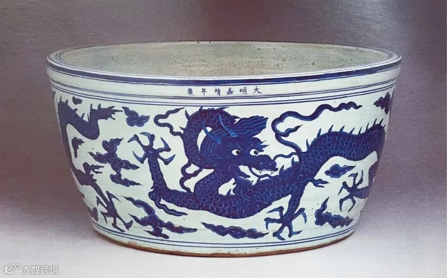 从成化到正德时期,未见明御器厂烧造大缸的记载,也不见传世品。嘉靖时期则是龙缸烧造的高峰期,这一时期烧造的龙缸不仅数量多而且器型大。嘉靖时期《江西省大志》载:“陶窑,官五十八座,除缸窑三十余座烧鱼缸外,内有青窑,系烧小器,内有色窑,造颜色。”世宗时期总共五十八座官窑,龙缸窑就占了一半以上。王世懋在其著作《窥天外乘》中亦载:“上忽命烧大缸,围至六七尺,所用土料、青料既多,比入火,十无二三完好者。坐是为虚费甚巨,而人莫敢言。”