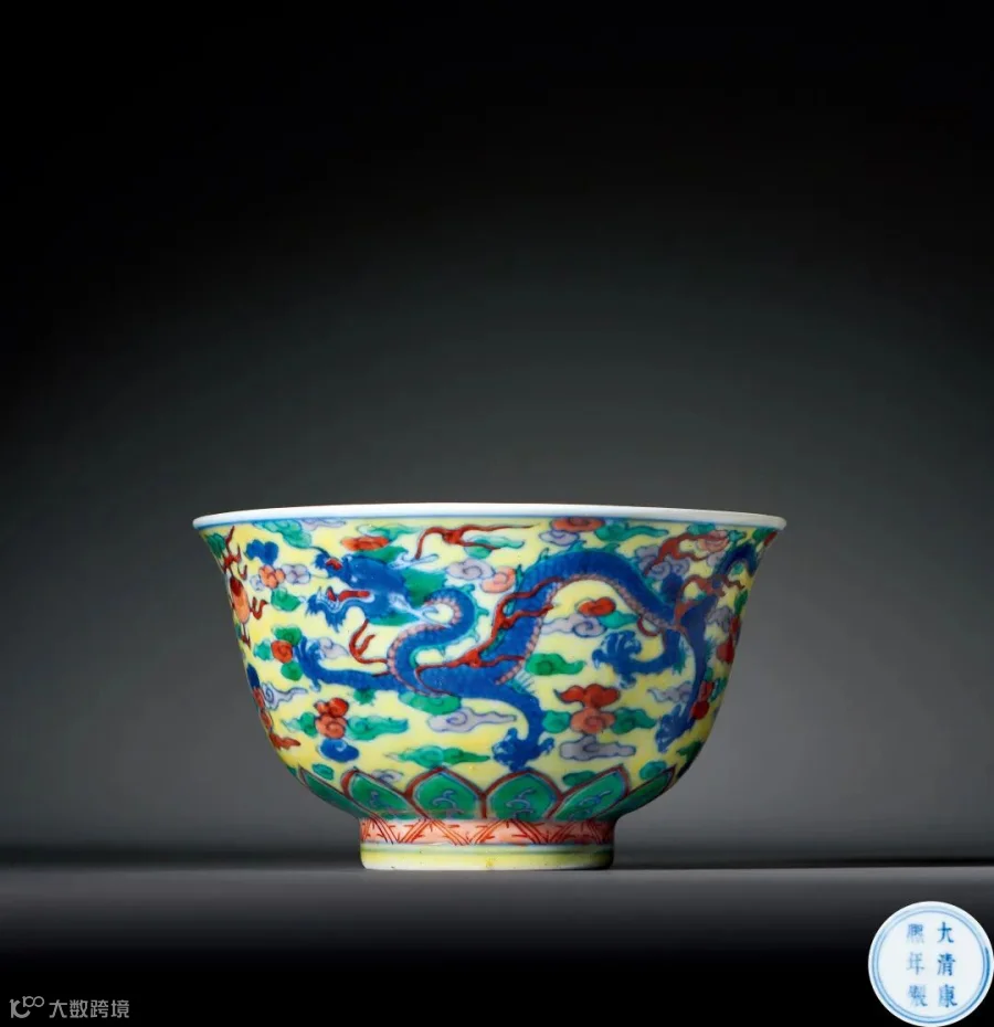 拍品胎质细密,釉面光洁。内壁施白釉,外壁敷黄彩为地,绘双龙赶珠纹,龙身以青花绘就,身形矫健,四周五色祥云缭绕,间以火珠,胫部饰莲瓣纹。青花发色纯正,与周围红、绿、紫、黄彩搭配协调,色彩鲜艳明丽。与故宫博物院藏康熙款黄地五彩云龙纹碗品种相同,同类黄地斗彩品种尚见有龙凤纹盘。据故宫博物院出版资料研究,黄地斗彩器于整个斗彩发展史上属于稀有,极为珍贵。