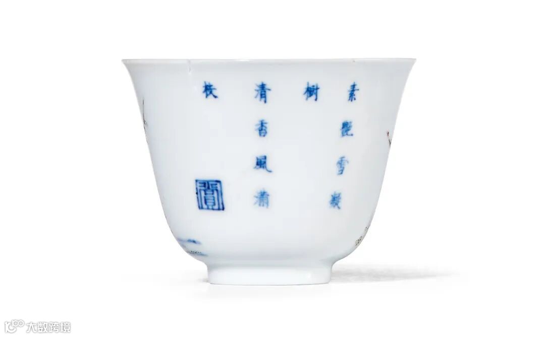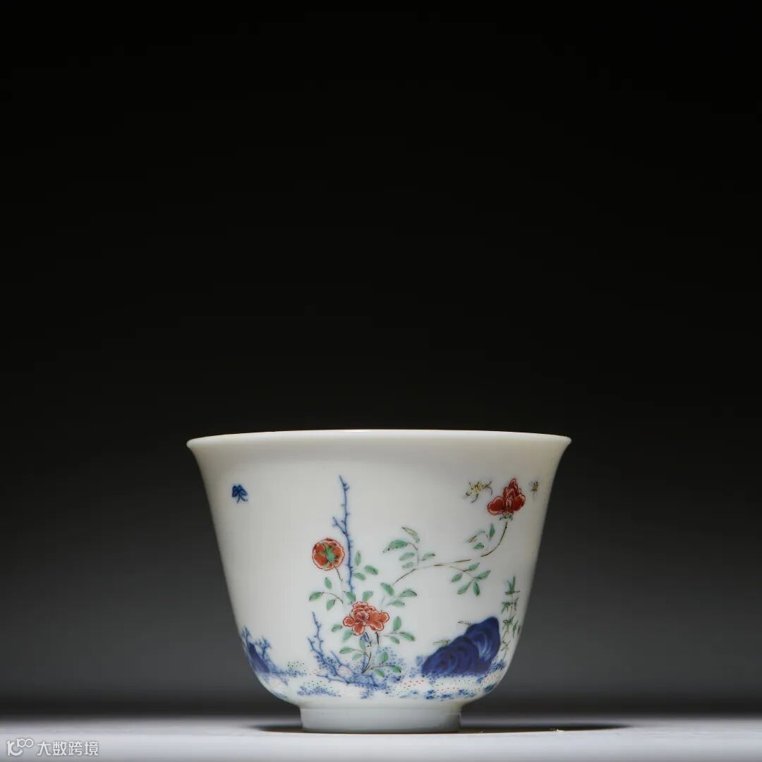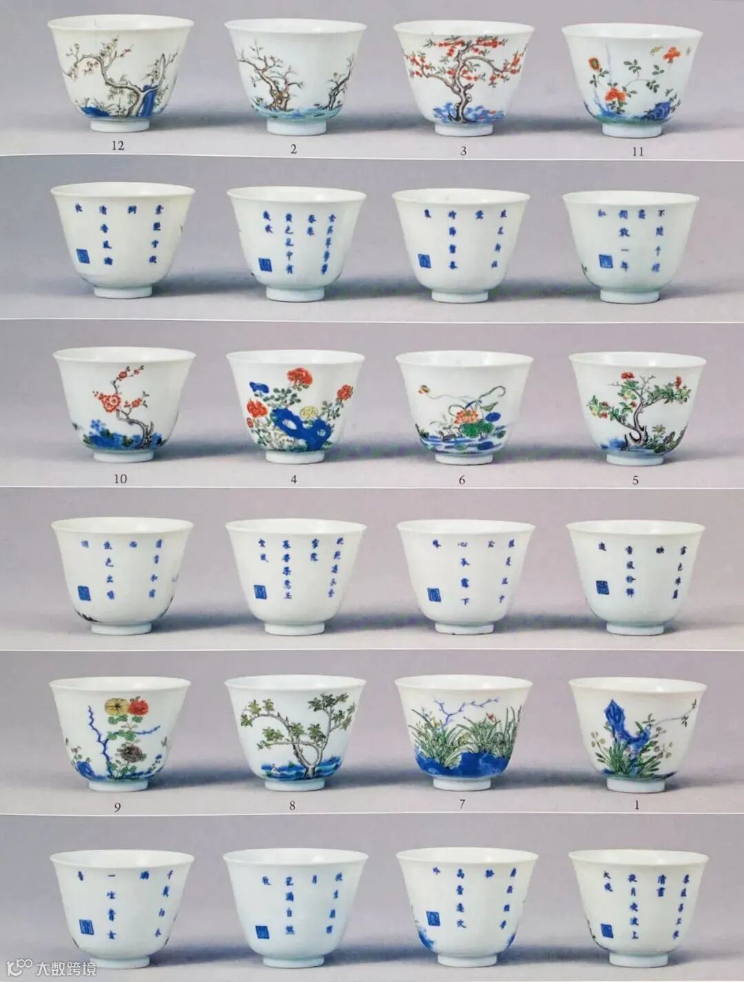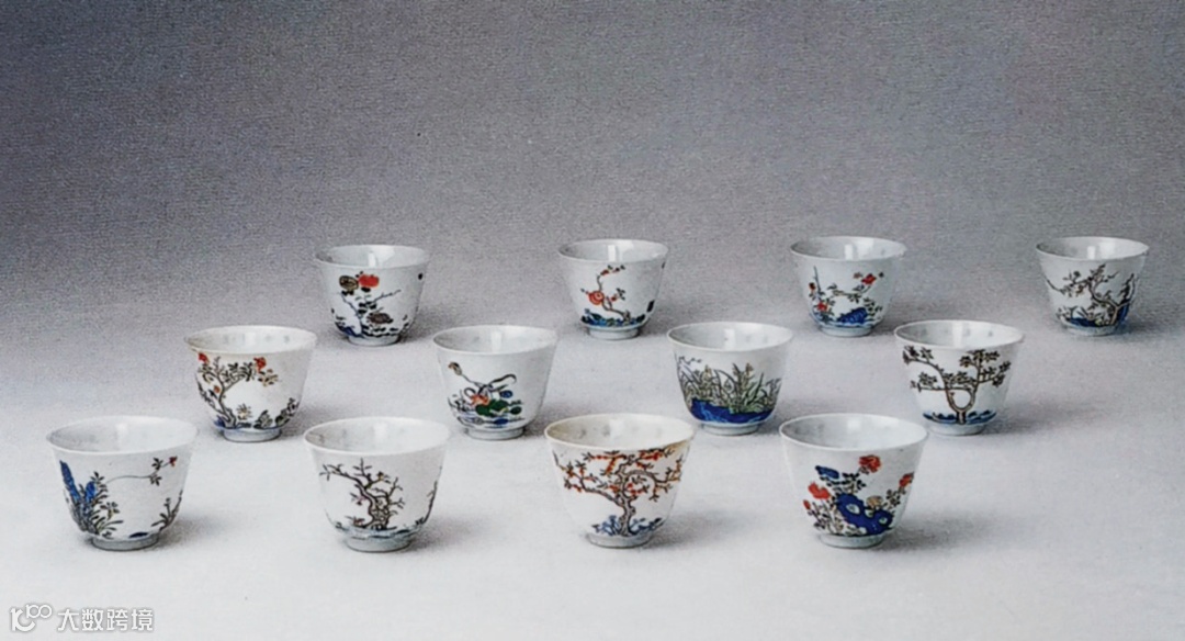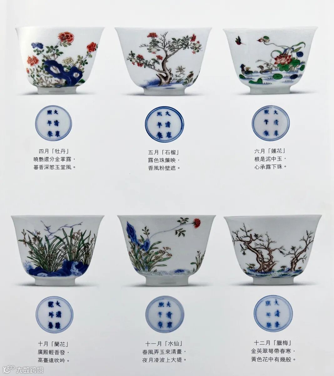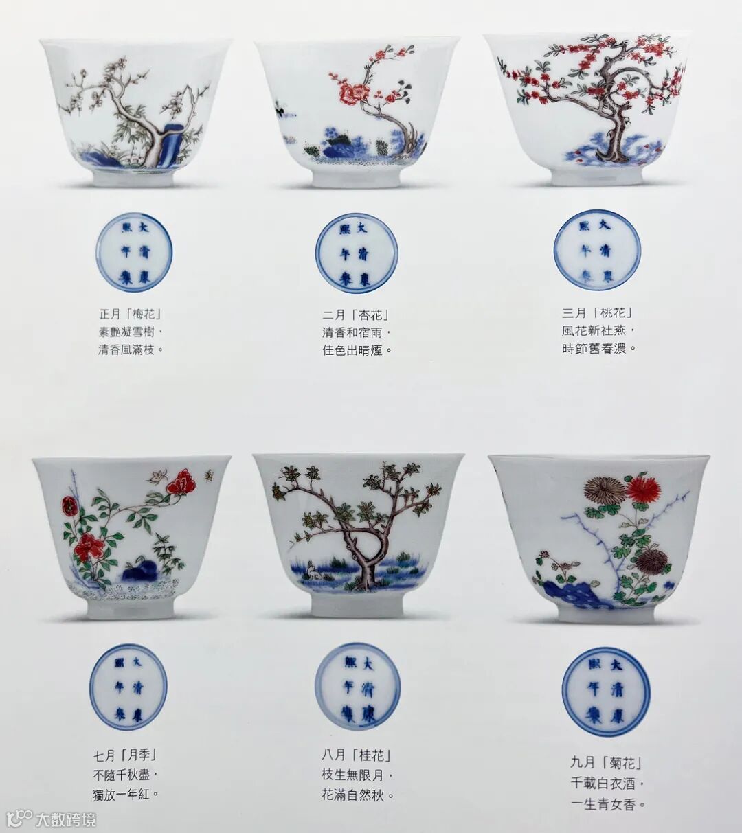 《陶雅》有赞:“康熙十二月花卉酒杯,一杯一花,有青花、有五彩,质地甚薄,铢两自轻。……若欲凑合十二月之花,诚戛戛乎其难。”当时“已而成对,或得四枚、六枚者,亦颇为难得。近则一枚、二枚且不能辄遇之矣。”