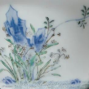 “春风弄玉来清画,夜月凌波上大堤”。水仙花傍水而生,其姿态飘逸清雅,有若凌波仙子,因此人们常将洛神喻为水仙花花神。LOT832 清康熙五彩「十二月水仙」花神杯,青花五彩色彩丰富。青花衬之,尤显玲珑娇俏。