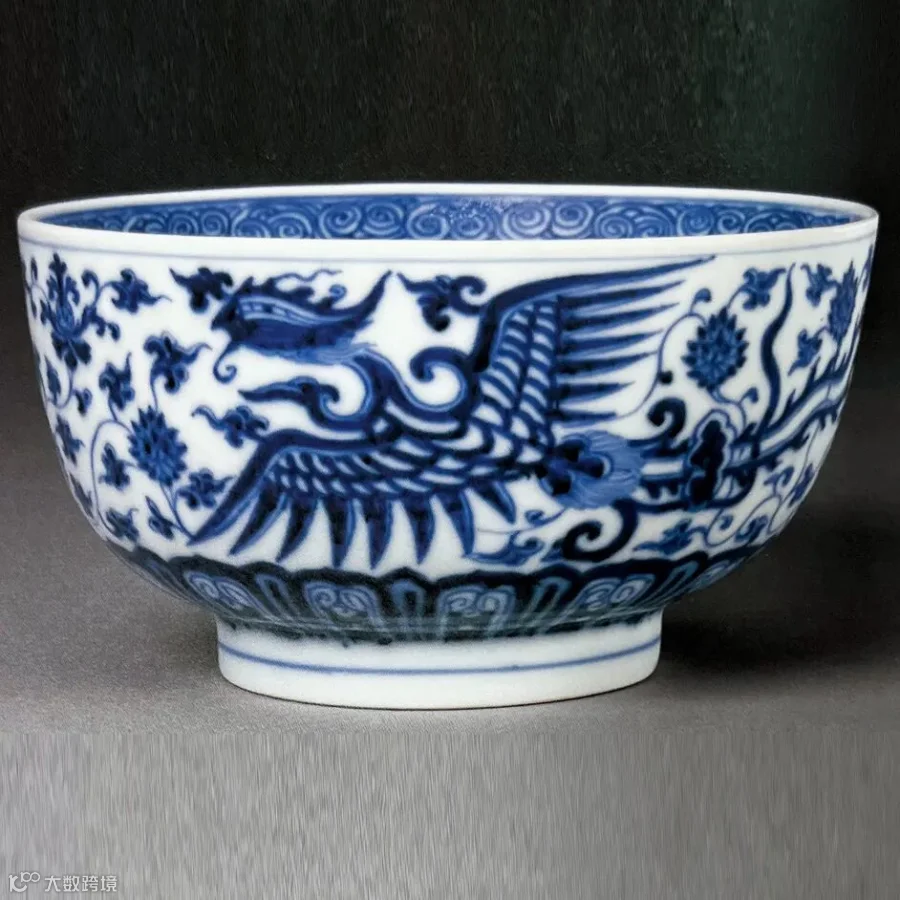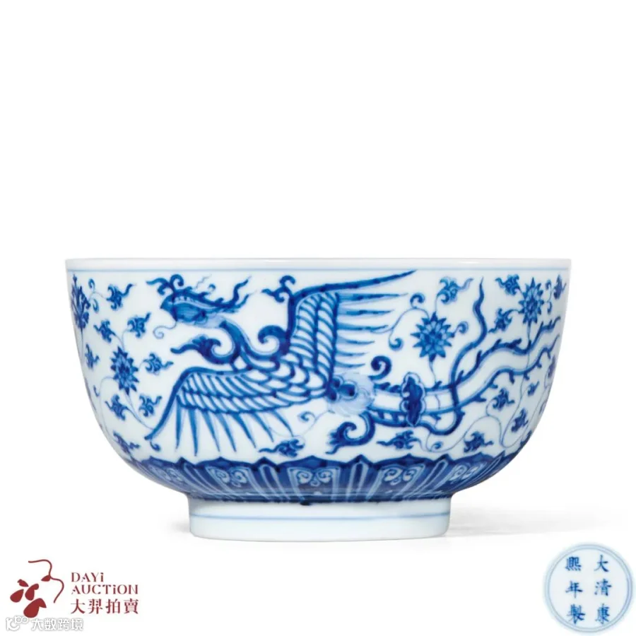 本品拍品碗型、凤纹画法、画面布局均与1984年出土于景德镇御窑珠山的“明永乐 矾红彩云凤纹碗”较为相似,碗心所绘如意云纹亦与故宫博物院藏“明永乐 青花云龙纹碗”碗心所绘云纹极为相似。康熙十九年(1680年)景德镇窑厂复立,自此开始,康熙御窑在传承前朝技艺的基础上不断创新,大器浑厚,制作精良,小器玲珑,巧夺天工。拍品应为康熙御窑对永乐、宣德御窑经典模仿之作,画工、布局、笔法更抒本朝新意于其间。