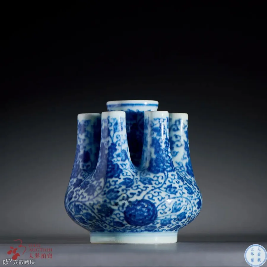 多孔器起源于东汉,自雍正时期将此类古代器形稍作改变,烧造出极具特点的新品种,见有五孔瓶、五孔扁壶、七孔尊等器形,均尺寸较大。据《清宫造办处活计清文件》记载,雍正六年(1728)五月二十六日,“太监刘希文、王太平、王常贵交来……仿宣窑青花白地七管花插一件、仿宣窑白瓷七管花插一件……六月十九日,太监马进忠持来仿宣窑青花白地七管花插大小四件、仿宣窑白瓷七管花插大小四件”,其中所称的小七管花插,应即此一品种。七孔尊器形小巧,造型规整,扁圆腹上竖立七管形圆孔,正中一孔稍大,周围围绕六小孔,通体以青花绘缠枝花卉纹。拍品传世罕见,其孔壁聚集处画工难以措手,而纹饰描绘一丝不苟,工艺精湛无匹,极为珍贵。