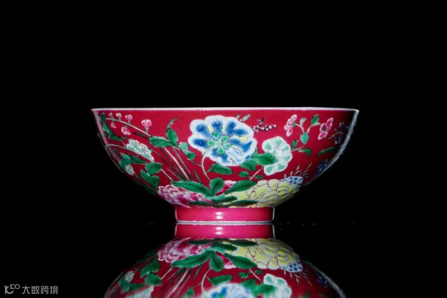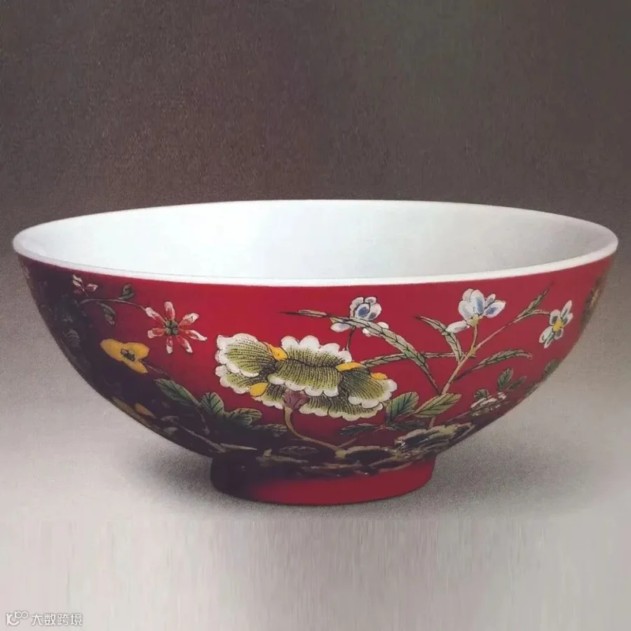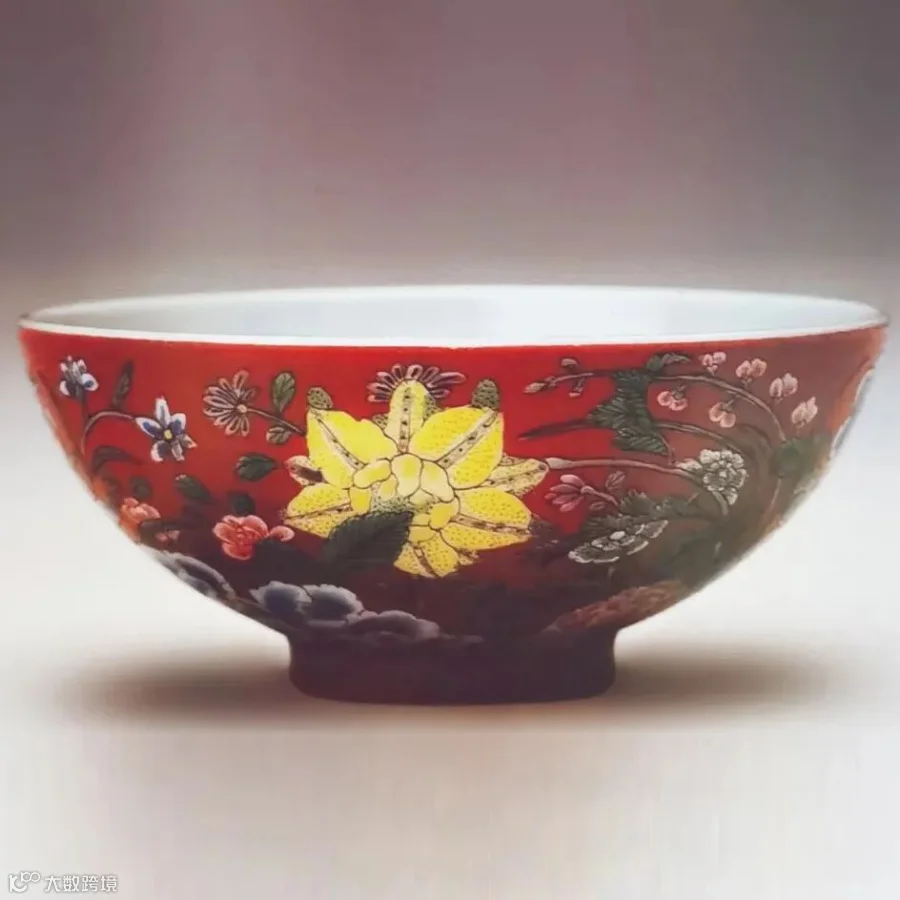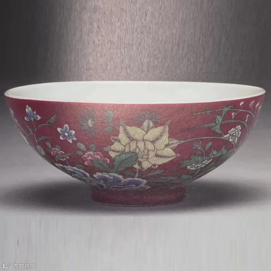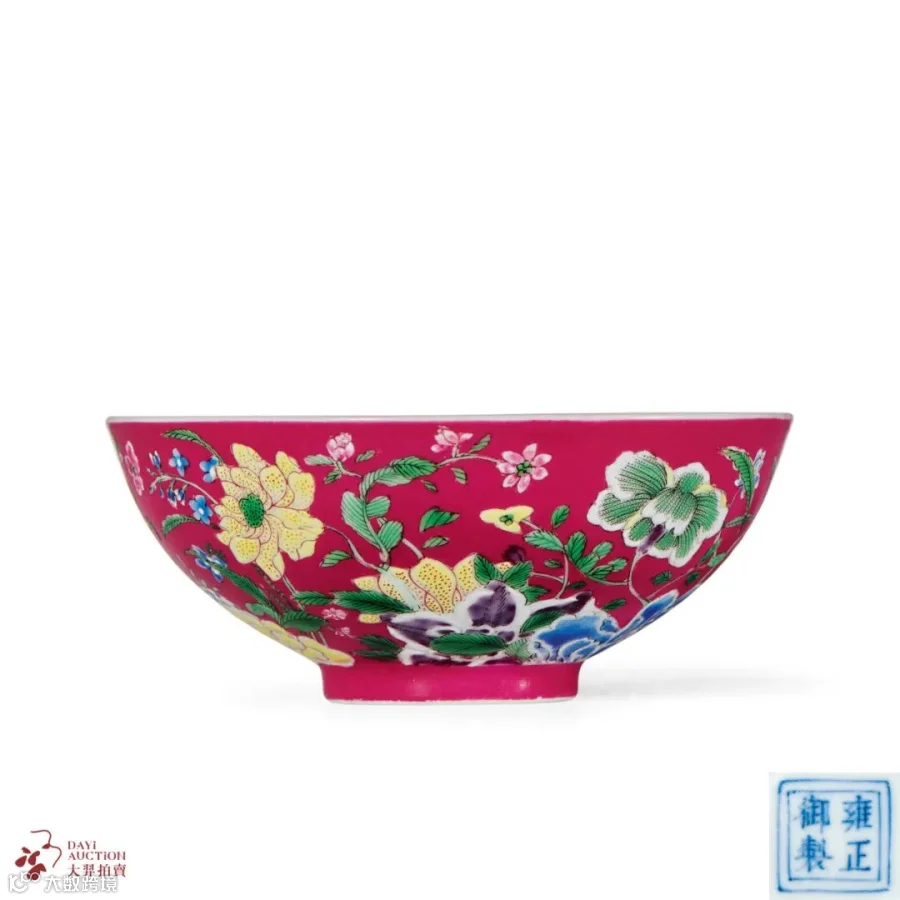 此件清雍正 胭脂红地珐琅彩九秋同庆图小碗,造型源自明代茶钟,成化至嘉万时皆有所见,明清时期口径为九公分左右的小碗统称茶钟或小茶圆,由尺寸规定可知其原来用途。外壁敷施胭脂红彩为地,色泽匀净浓妍,以诸色珐琅彩绘菊花、秋葵、芙蓉、秋海棠等九种秋季花卉,构成九秋图,寓意“九秋同庆”。并以绿彩和墨彩填绘勾描花叶、叶脉,风姿绰约,斑斓绚丽,花蕊、花心点画精细,侧视隐隐隆起,富有立体感,其中墨绿一色极为凝厚鲜亮,翠韵悠然,为后世所不及。碗底青花书“雍正御制”四字仿宋楷书款,外加双方框,亦与康熙朝形制一样,显然为雍正早期作品。