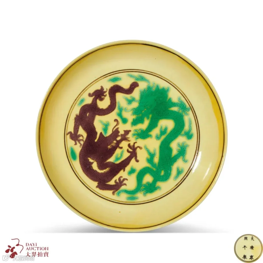 本件拍品器形规整,胎壁盈薄。内外通体施黄釉,盘心以紫、绿彩绘双龙抢珠纹,隙地衬以绿色火焰云纹。外壁对称饰四组葡萄纹,分别以绿彩绘枝叶,紫彩饰果实。整器制作工艺繁复,纹饰刻绘精细,色泽鲜艳明丽。保存完好,较为难得。
