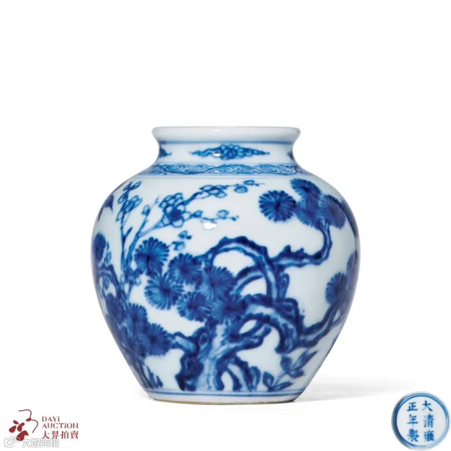 “三友”譬喻逢絶境而坚毅刚直,亦有长寿的寓意。宋·林景熙《王云梅舍记》:“即其居累土为山,种梅百本,与乔松修篁为岁寒友。”自元至清,岁寒三友饰纹甚为风靡。本品所绘清妍挥洒,布局章法俨然,画意清高,笔触圆润,青花发色鲜艳青翠,浓淡变化丰富,于温润莹白的胎釉映衬下将三友之风姿神韵一一展现。底为“大清雍正年制”六字双行楷书款,款字运笔清秀规整。本品为雍正一朝独有之器,以后官窑不复烧制。纵观全器,无论造型、画工、胎釉、写款皆无一不精,品格之高,犹可珍之。