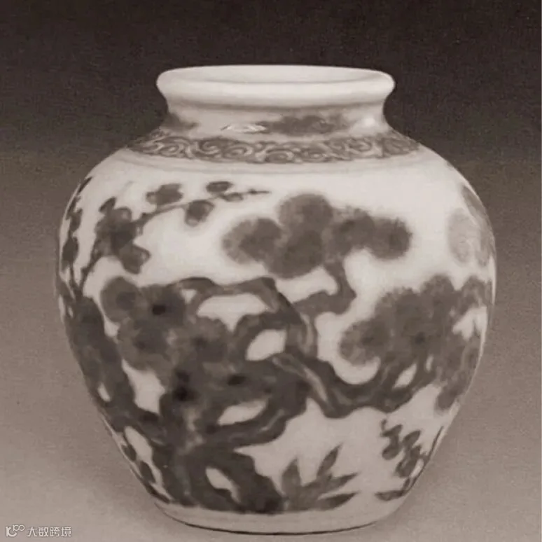 本品小罐唇口外翻,短颈,弧圆腹。造型丰满轻巧,盈手可握,别致玲珑。颈部四组朵云纹,肩部绘卷草纹,腹壁施青花,以岁寒三友为主题图案。乔松、修篁、瘦竹为友,枝干交叠,纠缠绵延,苍劲与秀美并存,生动传神,青花浓淡相宜,富于变化,富有清秀幽雅之美。松竹梅被誉为岁寒三友,松竹凌寒而立,经冬常青,梅迎新岁,先于群芳着花。