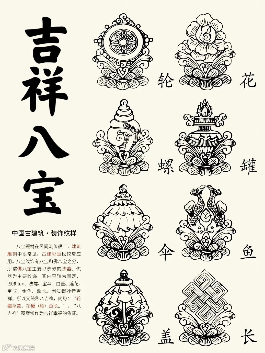 八宝纹样在乾隆朝臻于鼎盛,不仅因帝王崇佛,更因藏传佛教与满清政权的深度交融——法轮象征佛法常转,金鱼喻解脱之境,盘长结暗合帝王"江山永固"之念,将宗教仪轨与政治隐喻熔铸一器。
