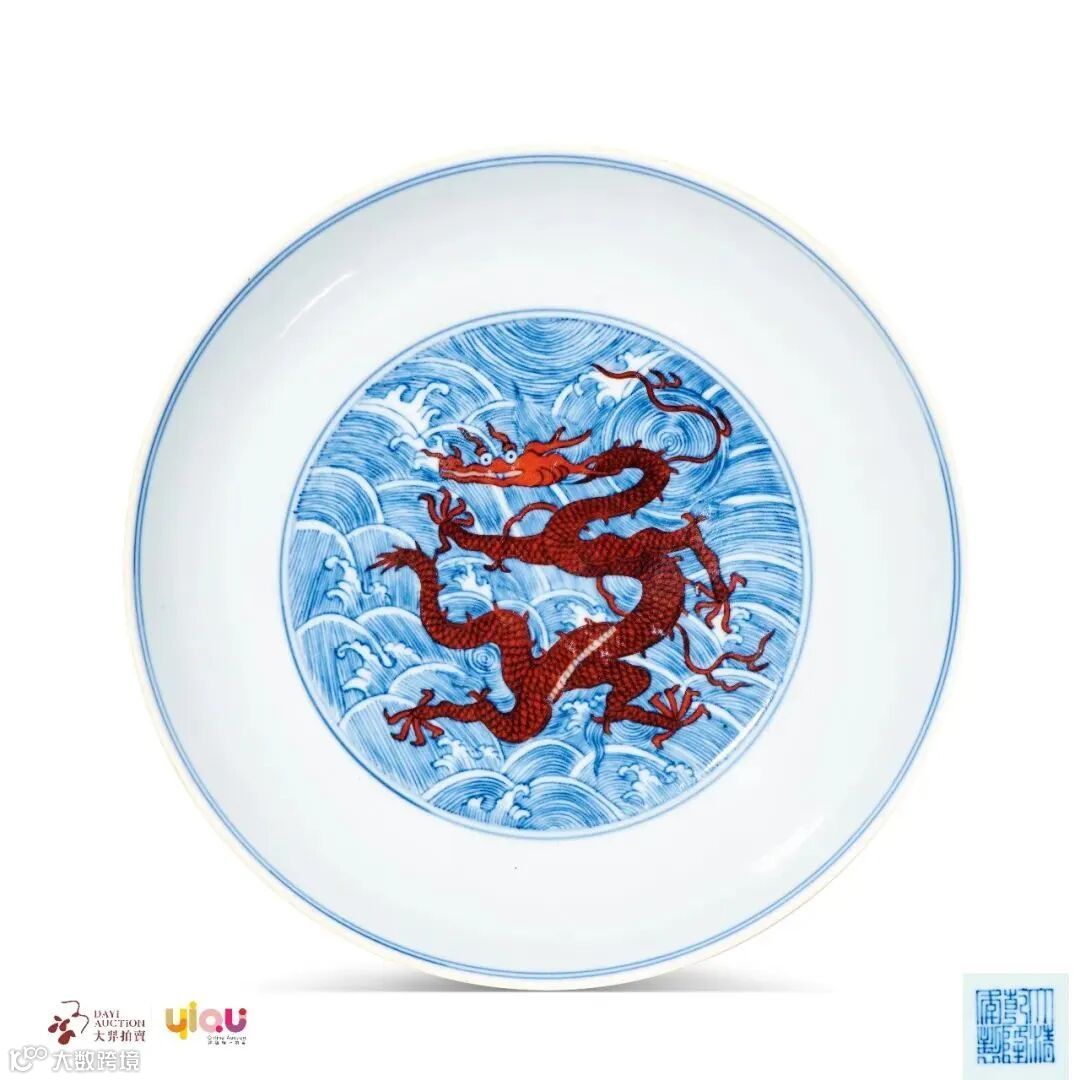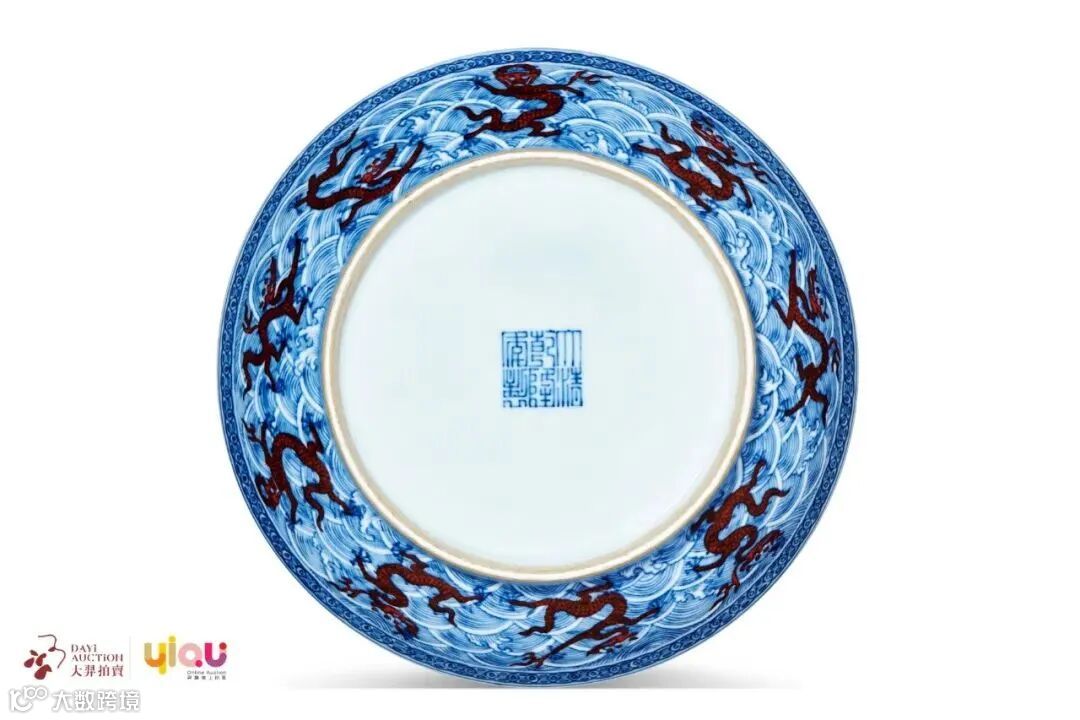 其形轻盈隽美,胎质细密,莹洁如玉,盘心绘海水侧面立龙图,外壁饰三组海水腾龙纹。以青花线描绘画海水纹,一丝不苟,虽繁密而清晰。以矾红装饰龙纹,色泽鲜妍厚润,色阶过渡自然,腾龙矫健有神,气势非凡。青花与红彩相互辉映,对比鲜明。