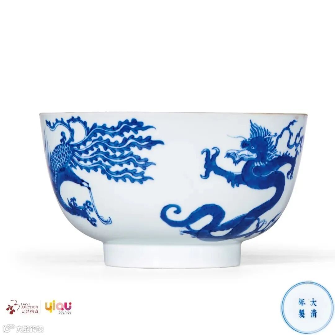 拍品胎体洁白匀净,晶莹清透,碗内壁隐约可见外壁之纹饰。外壁以青花绘腾龙飞凤两对。龙纹威武雄浑,腾空直立,龙首高昂,一侧的飞凤亦翱翔天际,两相呼应,气势独立。此碗构图简洁,外壁所绘龙凤纹与北京故宫博物院收藏的康熙朝青花盖杯所绘纹样一致,与之类似的三爪龙纹,亦见于康熙官窑青花罐上,风格同样苍劲有力。
