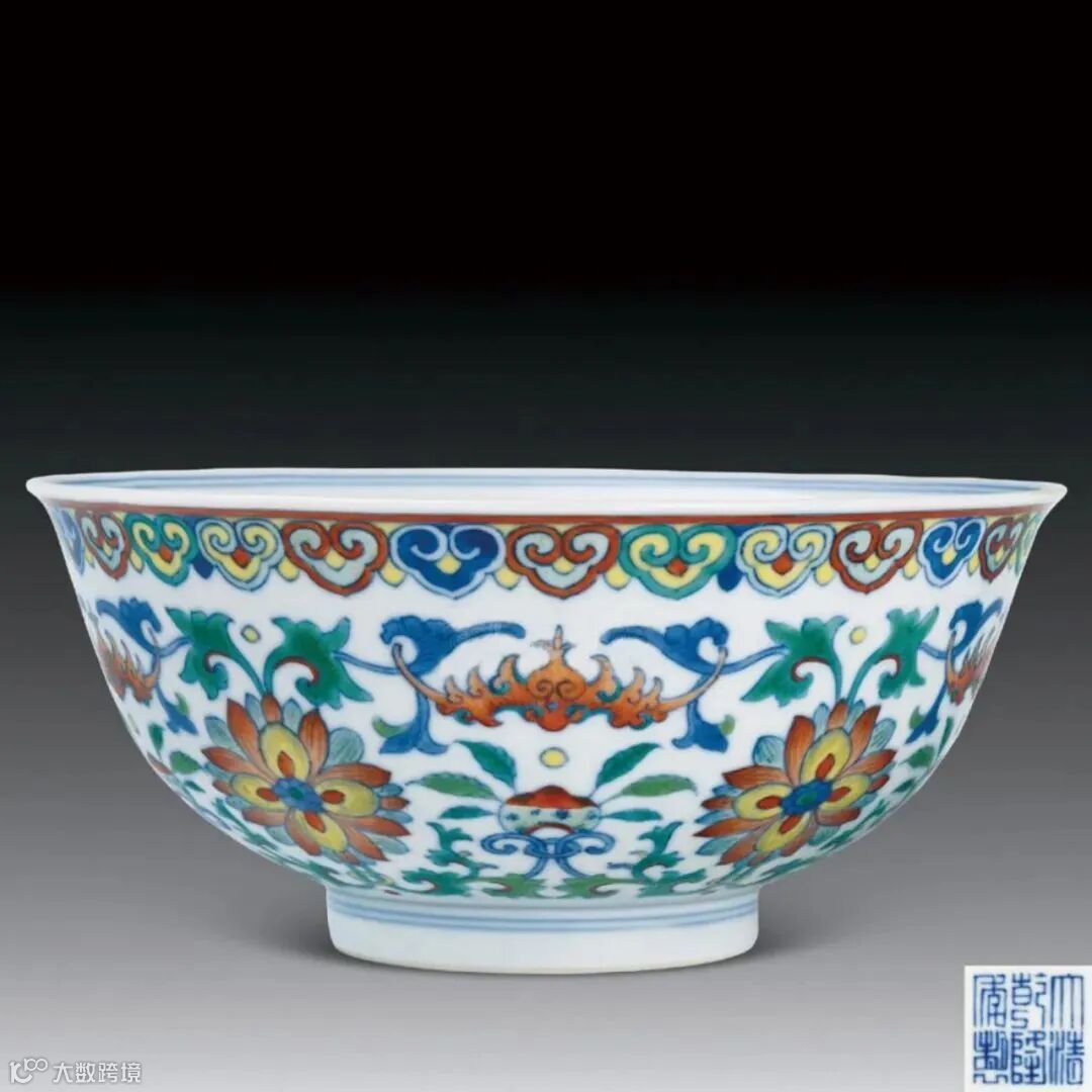 中国传统装饰纹样向来讲究“图必有意,意必吉祥”的原则,这一点在清代官窑纹样的设计上体现的尤为明显,本件可为一例证。此碗形制规整,撇口弧腹,圈足,底落「大清乾隆年制」六字三行篆书款。通体施釉平滑温润,外壁斗彩描绘纹饰,以青花勾勒边线,内填饰黄、绿、矾红等色彩。口沿所绘为如意云头纹一周,腹部绘红蝠口衔丝带缠绕的罄,以此谐音“福庆”,中间以枝叶缠绕的莲花间隔,寓意“连绵”,故整体寓有“福庆连绵”的吉祥含义。整体布局饱满繁复,各色釉彩填饰精确,花纹清晰华丽,自然流畅,色泽鲜艳,为乾隆官窑典型作品。