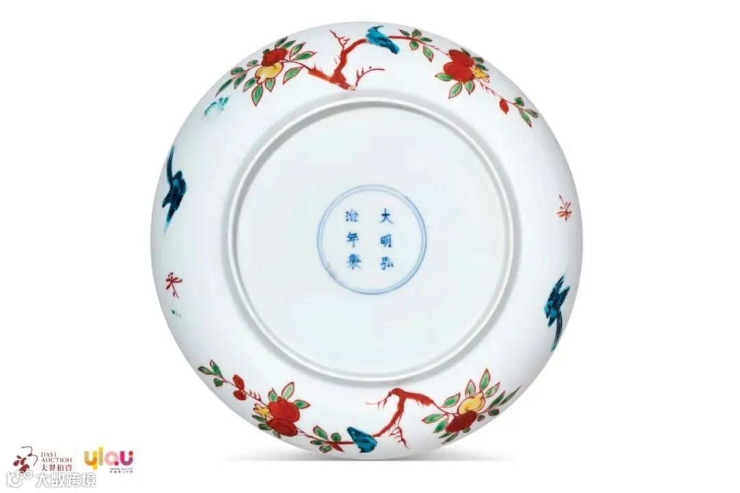 盘心绘五彩双狮,上下相对而视,欲争抢绣球,所绘狮子造型蓬头大耳,巨目环睛,娇憨可爱,逗人喜爱,是意象化的艺术形象,与自然形态的狮子大不相同,其作为守护装饰和辟邪之用,也是权势的象征,周围饰以绣带。本品画工流畅,笔触细腻均匀,彩料厚润,衬以坚致白皙的釉面,更见雅趣动人。底心青花双圈内书“大明弘治年制”六字双行楷书款。此类纹饰的青花瓷器,在永宣时期官窑上亦有出现,成化、弘治时期出现的较少,可证本品之稀少。