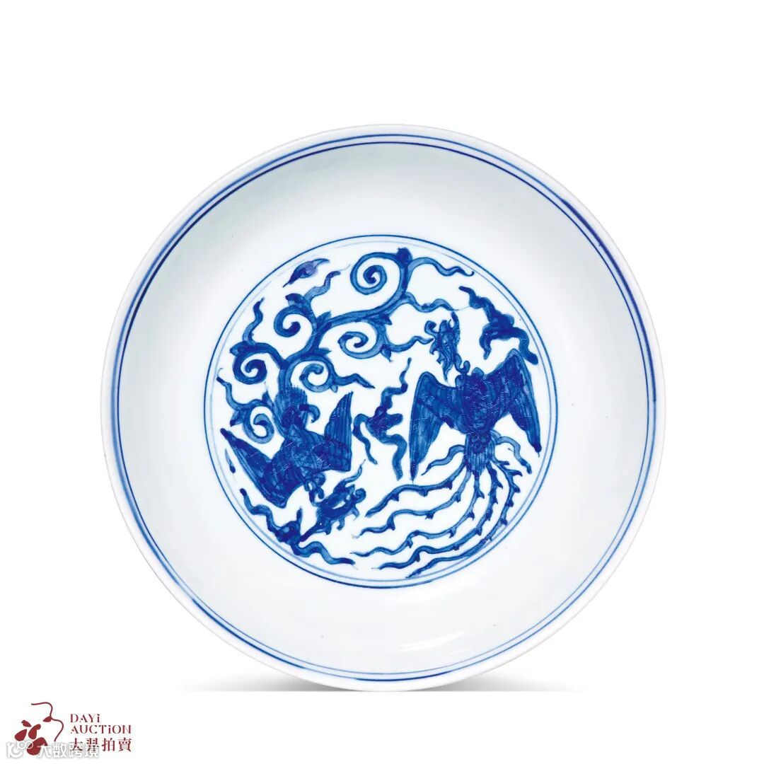 拍品撇口,浅弧壁,平底,圈足,盘口饰两圈简素线圈,盘心及外壁各绘双凤穿飞于“壬”字祥云中,笔意稚拙可爱,所绘凤纹飘逸灵动,极具神气。作为中国古代神话中的百鸟之王、四灵之一的凤凰,自古是人们心中纳福迎祥的吉瑞之鸟,被广泛运用于各类装饰图案中。至明代规定只有皇家才能使用龙凤形象,其他臣民不得逾制,令凤纹纹饰唯呈宫廷之风,不带一丝躁气。