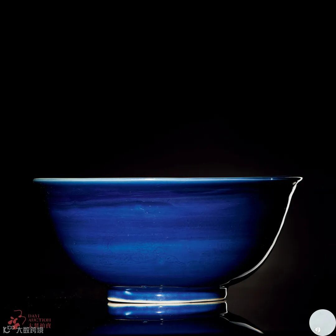 此霁蓝大碗为明代皇室典型的祭祀用瓷,其形制硕大,胎体厚重。通体以回青施霁蓝釉,釉色浓艳。外壁暗刻云龙纹,器底白釉暗刻“大明万历年制”楷书款。北京故宫博物院清宫旧藏有同类万历霁蓝釉大碗。