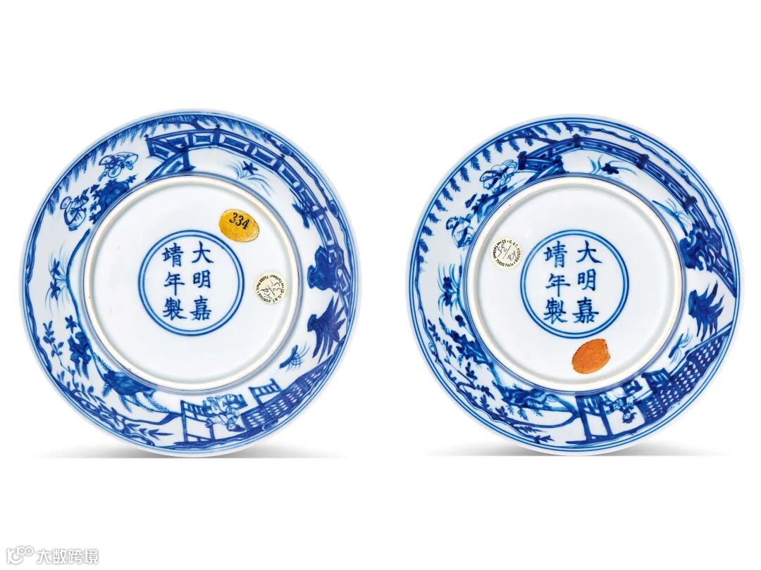 盘外壁绘青花仕女游园图,画面见一仕女端坐于庭院中小憩,二童子正于草地上作斗草游戏。庭院中柳树浓荫,勾栏严整,湖石嶙峋。外底心青花双圈内书“大明嘉靖年制”六字双行楷书款。此式盘,首创于明宣德御窑,而且外壁搭配不同纹饰题材,如庭院仕女、唐宋诗意、二十四孝等。因其纹饰经典,故成为清代御窑中的经典品种,延烧至清末。