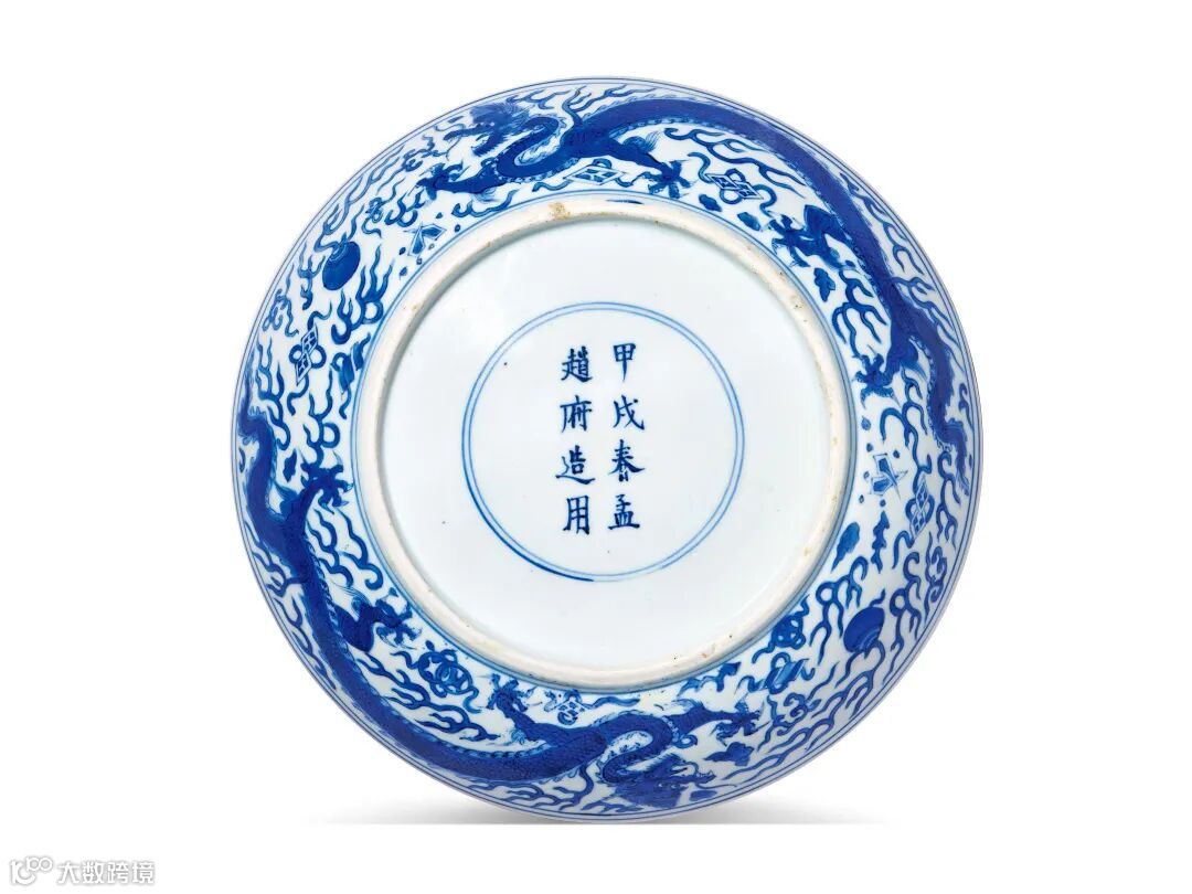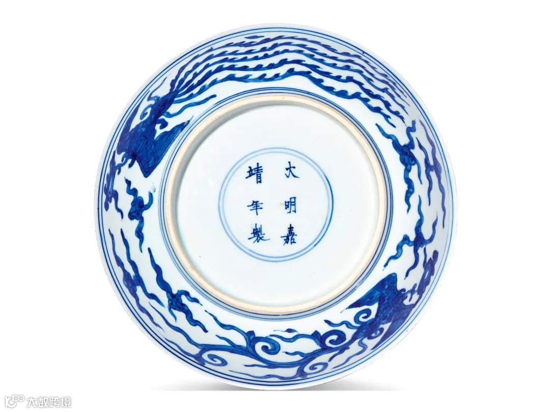 另一件明代青花云龙海水纹盘形制端庄,胎质细密,盘心青花双圈内绘正面龙飞腾于海水之上,外壁游龙首尾相逐,间饰海浪云气纹通景纹饰,所绘龙形矫健,身体修长,双目炯炯,足见明嘉靖青花纹饰绘画水平之高。