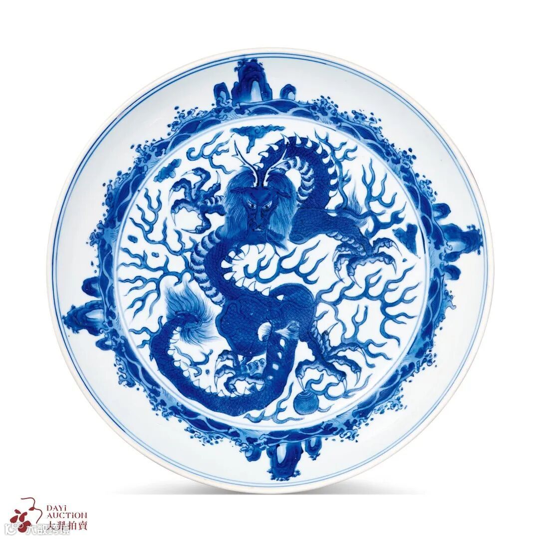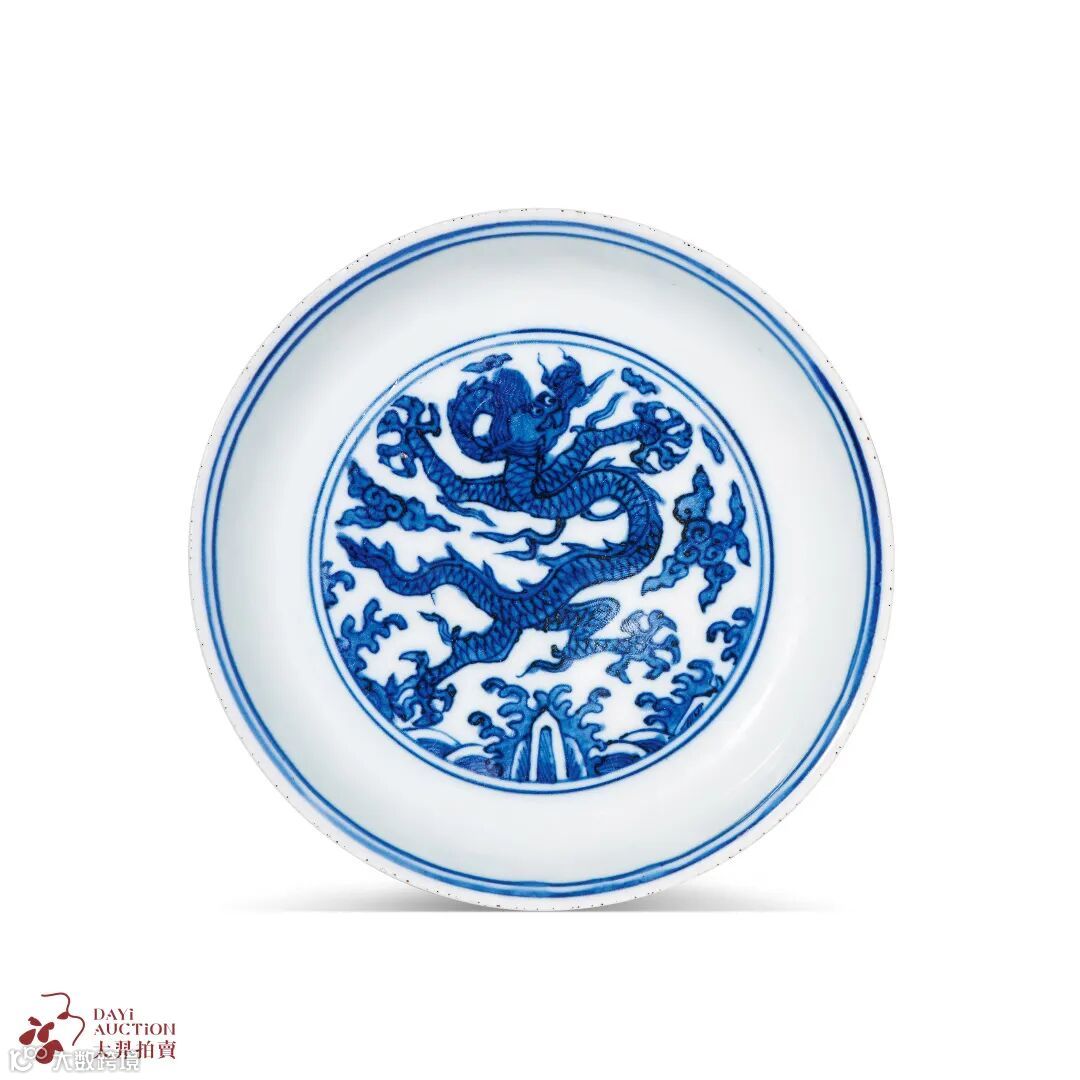 此盘一改明初盘心行龙,以正面龙纹代之,双目炯炯,面目苍严威武,五爪遒劲锋利,腾飞云间,更耀龙威,暗示龙泽万物,四海归一。同类见中国国家博物馆有典藏,殊为可贵。