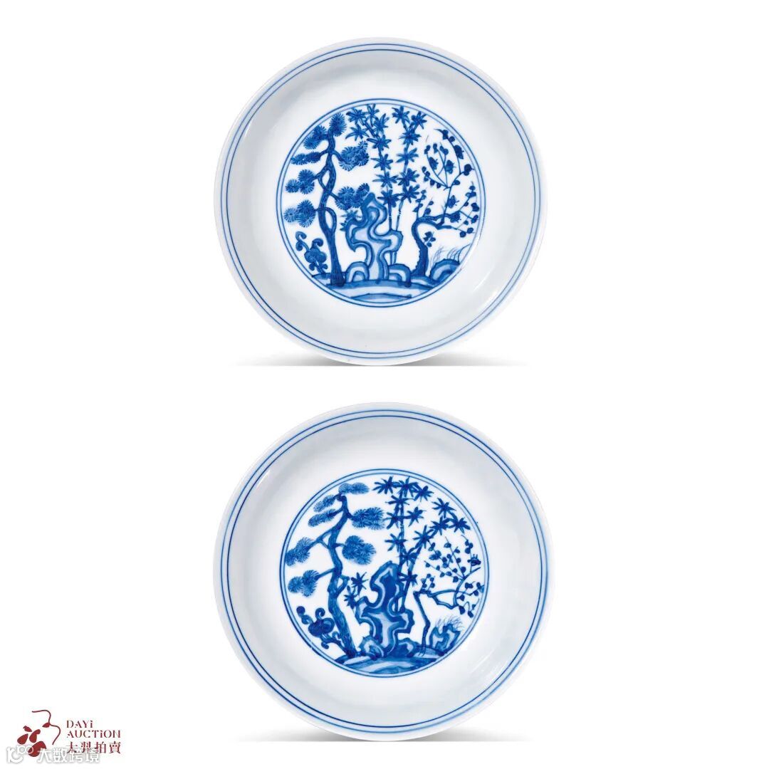 青花外庭院仕女内松竹梅纹盘一对