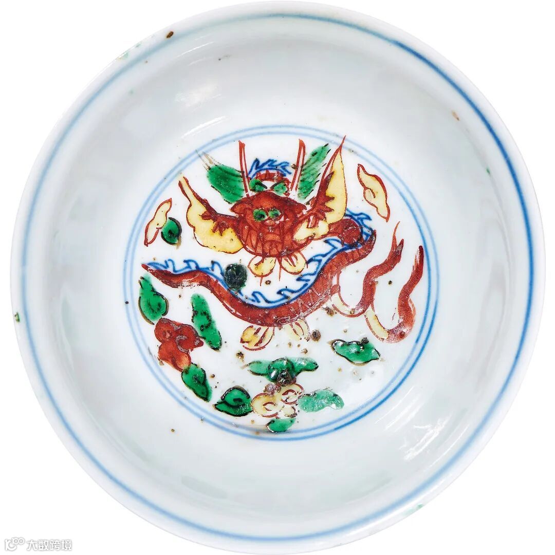 万历御瓷承袭承前朝装饰之遗风,依然流行道教神仙故事人物纹样,此五彩碗即为一例。其外壁绘张天师驱鬼图。张天师即张道陵,东汉时创五斗米道,治蜀地八部鬼神、六天魔头,以驱鬼辟邪闻名于天下。