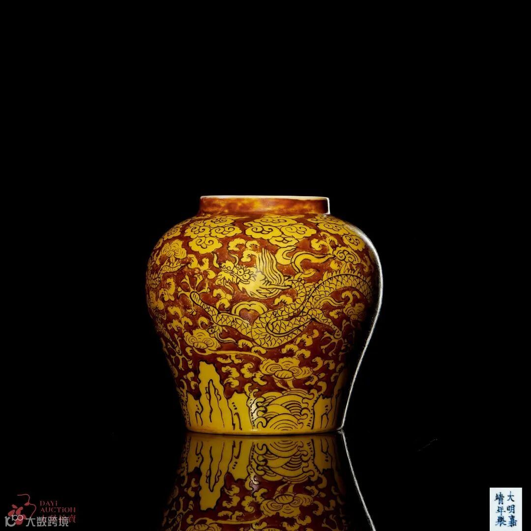 本品造型敦实而秀润,全器以黄彩为色地,以矾红彩绘画纹饰。器身肩部绘如意云一周,腹部主题纹饰为双龙驾腾于寿山福海之上,花饰繁缛丰富,笔意潇洒恣肆,云龙古拙可爱,虽无永乐、宣德盛世威武刚猛之气,却独具古趣,为嘉靖时期特有之风格。