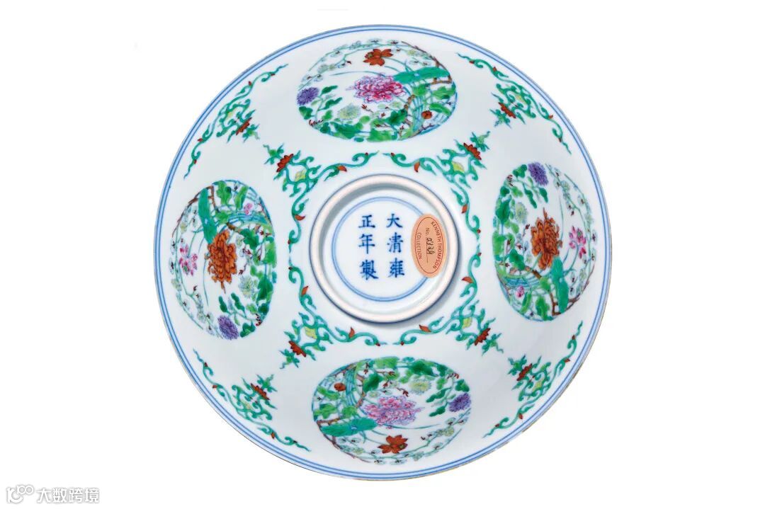 最妙在碗心——青花双圈内精绘团蝶,外壁绘四组团花,间饰俯仰勾莲纹,疏密有致。青花线纤细流畅,填彩精准,红色油润,绿色莹亮。这哪里是饮食器皿?分明是雍正朝造办处以瓷为纸、以窑为砚,写给二十四节气的精妙情书。彩瓷设色之难尤甚,浓艳过度流于媚俗,淡薄不足失却本意,唯独雍正一朝画笔逸丽清新,构图别具一格,将两者巧妙融汇于一体,雅致脱俗。