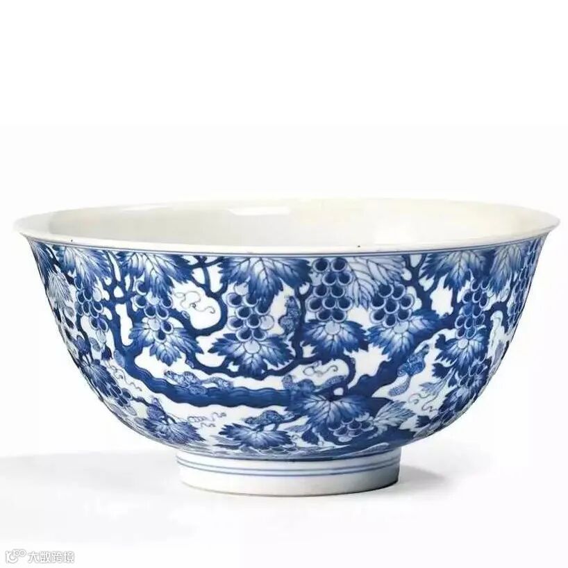 另有乾隆青花松鼠葡萄纹碗则是盛世匠心的绝妙注脚。外壁以青花绘松鼠葡萄图,藤蔓盘曲如篆书笔意,葡萄垂垂若紫玉缀枝,松鼠腾跃其间,须爪纤毫毕现,暗合《西清笔记》中“葡萄百子,多福多寿”的祥瑞寓意。画工精湛娴熟,青花发色明艳,葡萄纹被称为“一串金”,象征着五谷大获丰收和富贵,成串的葡萄还有“多”的含义。
