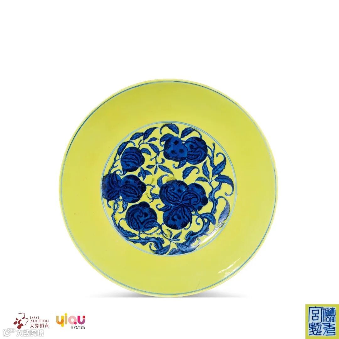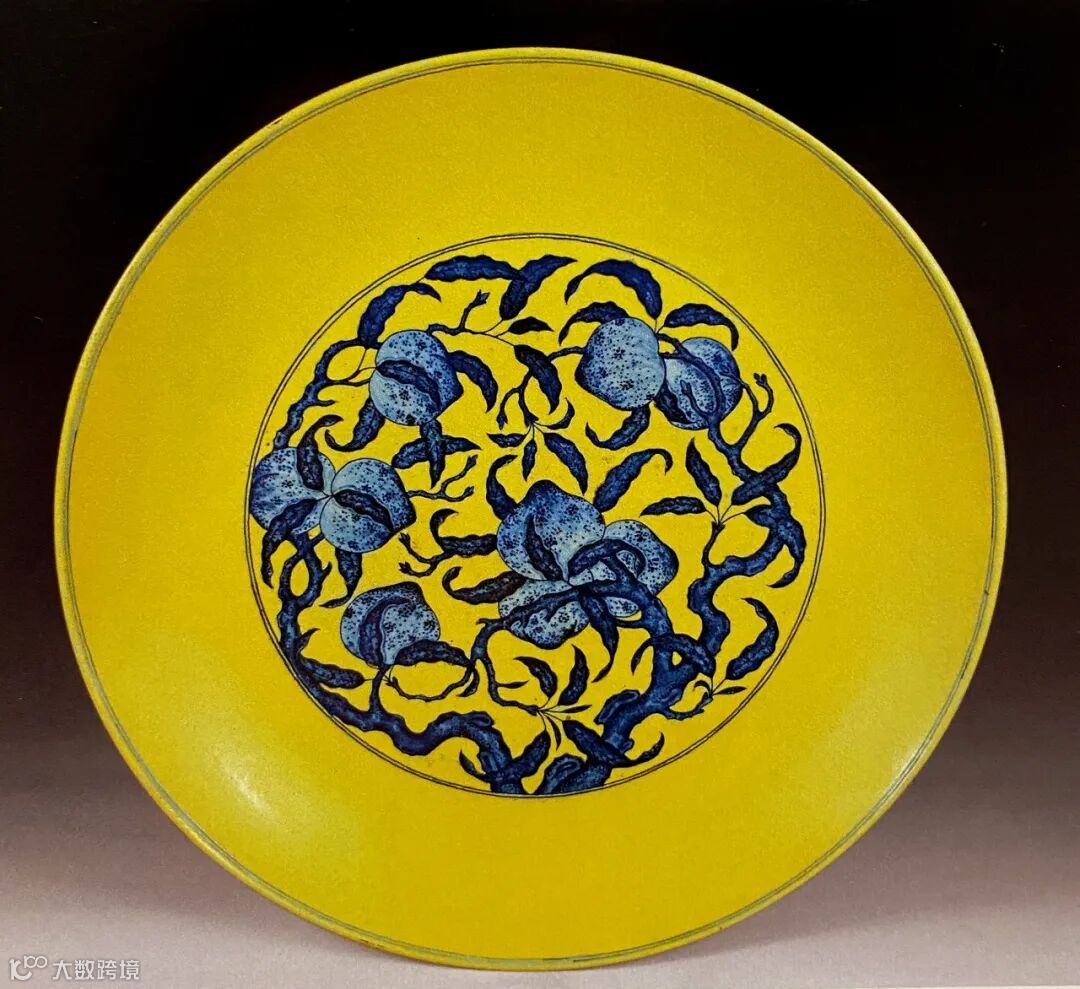 清光绪黄地青花九桃纹盘,则是晚清宫廷对春日的最后一曲挽歌。盘心以青花勾绘九桃缠枝,桃实累累缀于黄釉之上,恰似《齐民要术》所载“仙桃九千年一熟”的瑶池幻境。黄釉明艳如初阳,青花沉静似暮云,二者交融处暗含“乾坤交泰”的哲学隐喻。虽光绪瓷胎质略逊前朝,然此盘纹饰布局疏密有致,桃叶翻转如吴带当风,依稀可见康雍盛世的余韵。