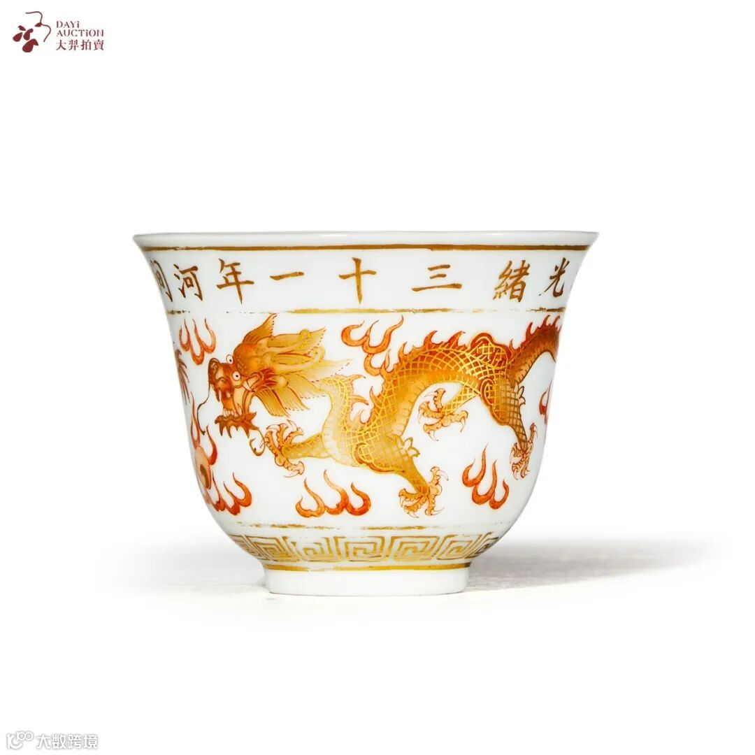 拍品撇口,深腹,敛胫,圈足,内口沿饰一周锦纹,杯心书墨彩“整军”二字楷书款。外壁口沿书金彩“光绪三十一年河间附近秋大操记念”十六字单行楷书款,杯身绘矾红彩描金云龙纹,龙为四爪,胫部饰金彩回纹。 秋操杯,是中国官窑历史上较为少数的纪年杯,为晚清光绪年间所举办的几次军事操练所定制。