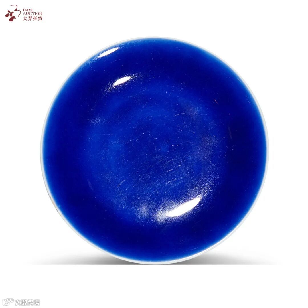 拍品敞口,弧腹,矮圈足,盘形规整,胎质细白致密。内外施霁蓝釉,色如蓝宝石,明艳照人。此种霁蓝釉品种应为清宫设置在天坛祈年殿中祭器,与霁蓝釉烛台、香炉等搭配使用。霁蓝作为瓷质五供的基本色釉,沿袭广泛,顺治朝天下初定,随即烧造祭器,可见祭器对国家礼制的重要性。本品亦然,代表乾隆时期清宫祭器的顶端规格,级别非比寻常。