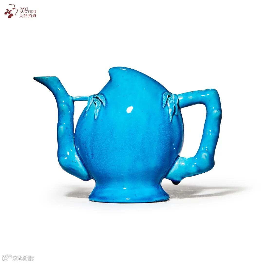 乾隆一朝瓷壶烧造数量颇大,造型种类亦十分丰富,本品即属其中倒流壶一类。器身作寿桃状,饱满秀丽,流、执呈桃枝样式,虬曲挺拔,器身通施孔雀蓝釉,釉色明亮娇美,施釉润泽匀净。倒流壶早在宋代即已出现,如陕西历史博物馆所藏著名的北宋耀州窑青釉剔花倒流壶。本品底留圆形小孔,作注水之用,穷尽巧思。
