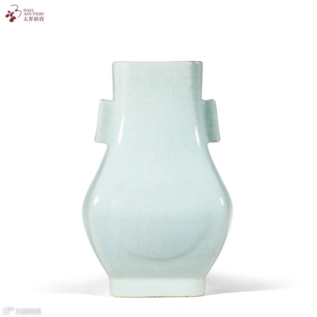 拍品为清代御窑经典品类,形制规整,口呈四方倭角形,垂腹微鼓,下承四方足,颈部两侧饰管状双方耳,腹部两面饰凸起杏圆。通体施仿哥釉,釉质肥腴,釉色明快,釉面可见冰裂开片,简洁雅致。全器简约淳美,光素而不事雕饰,富有天然韵致,陈设效果极佳。此式贯耳瓶始烧于雍正时期,此后各朝皆沿袭烧制,本品即为其中佳作,可堪珍藏。
