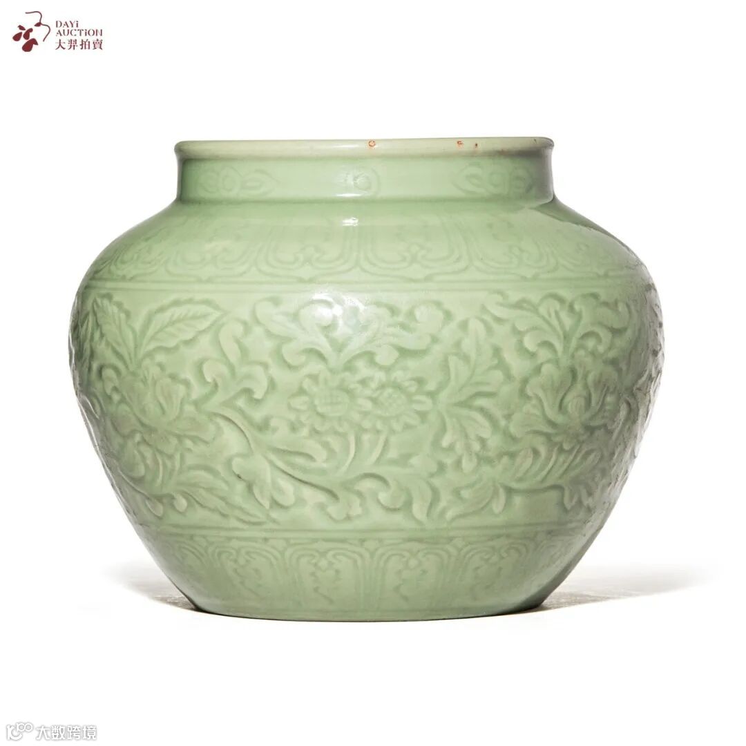 明早期 龙泉青釉剔刻缠枝花卉纹罐
