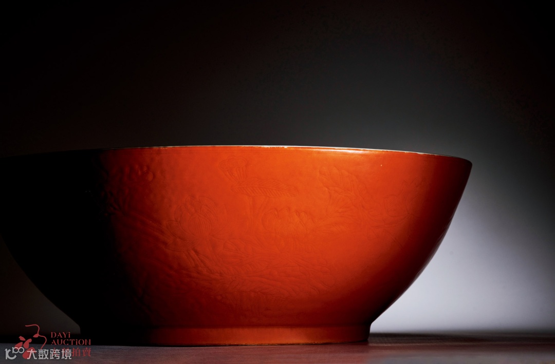 珊瑚红釉暗刻莲池纹大碗