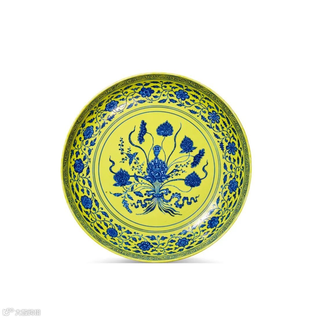 黄地青花一把莲纹盘