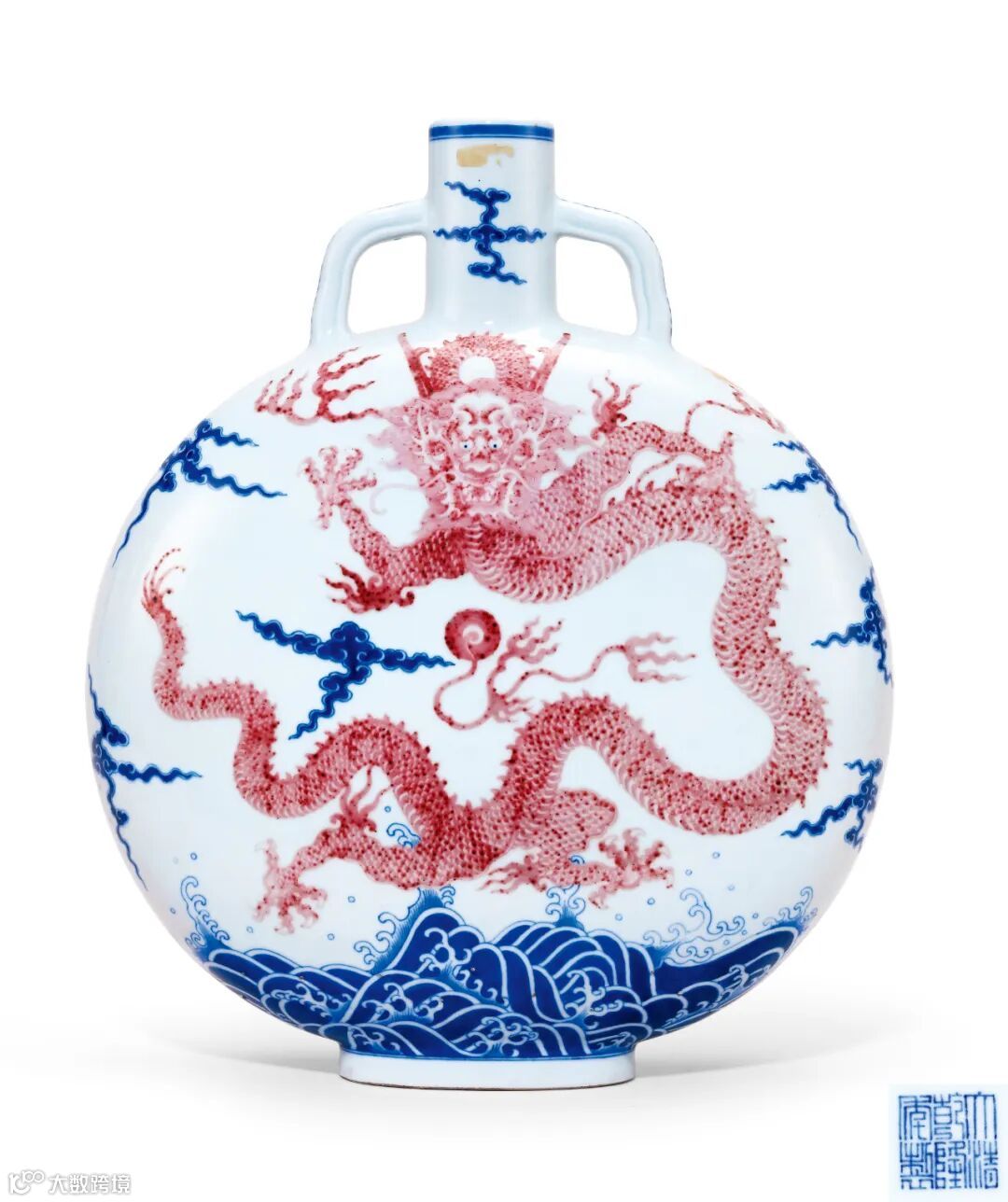 清乾隆 御制青花釉里红海水云龙纹抱月瓶以成交价23,575,000元顺利交割,此式器型系受西亚文化启迪而出现,肇始并流行于明代永乐、宣德时期,拍品造型乃借鉴永宣官窑青花大扁壶并稍加化裁而成,称为“抱月瓶”或“宝月瓶”。至清代雍干时期皆有仿烧,并较之原型更见清秀,此瓶于清档之中亦称为马挂瓶。乾隆皇帝对此式样甚为钟爱,多次谕旨唐英为之烧制,存世所见品类繁多,可见当年烧造之盛。