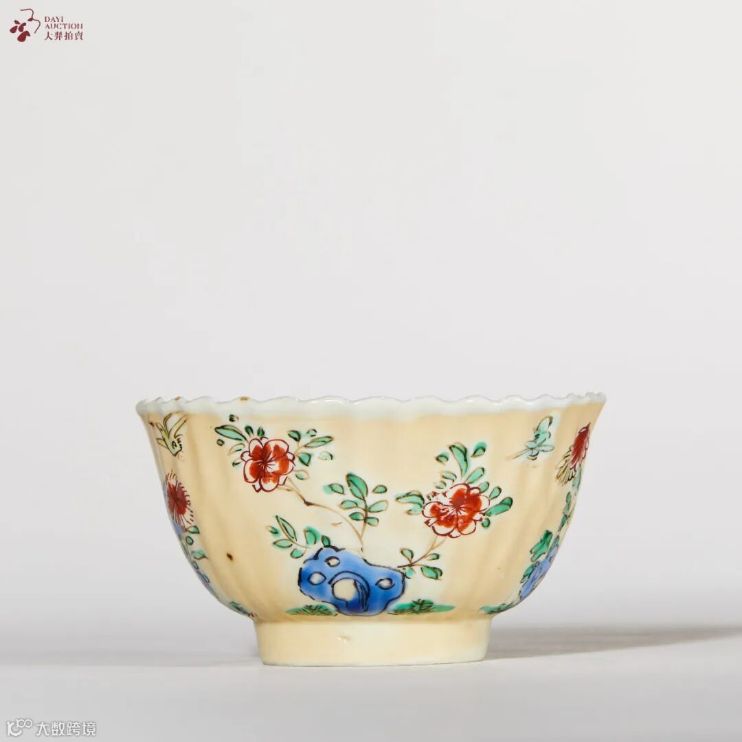 清康熙 外米黄釉内粉彩花卉蝴蝶纹杯